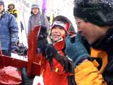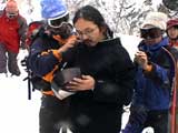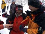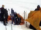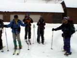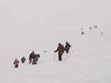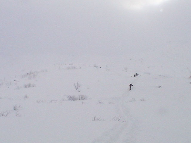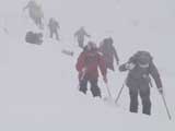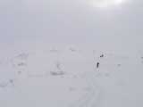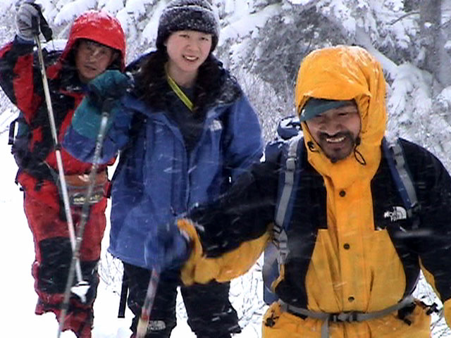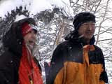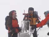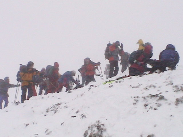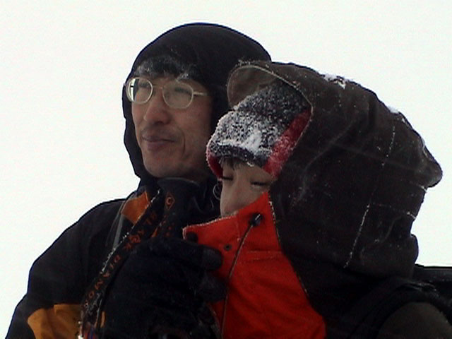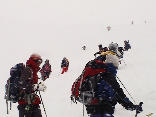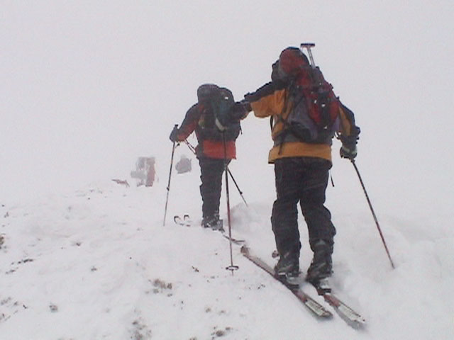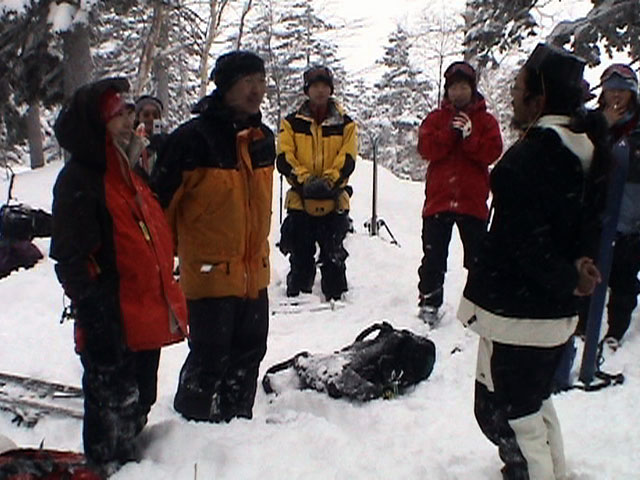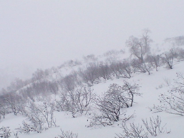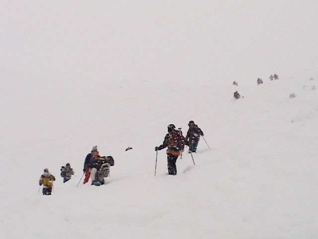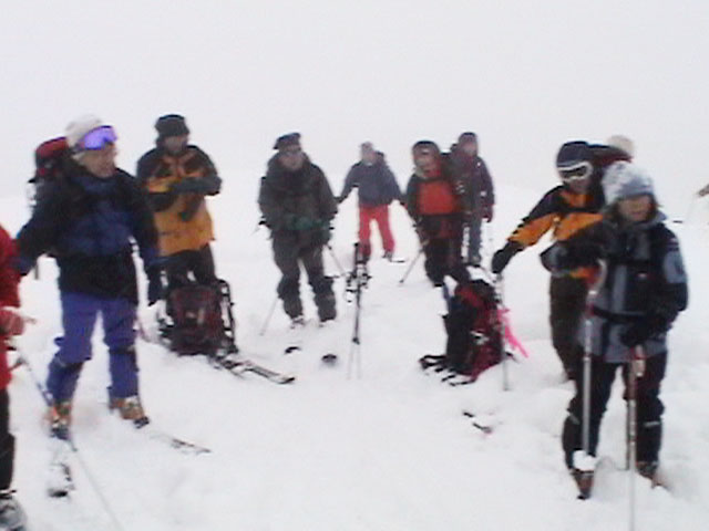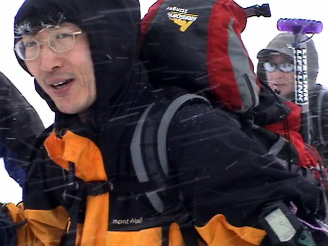 | 2004年1月11日(日) 三段山スキーツアー(三段山山頂結婚式) この日は、HYML(北海道山ML)の創設者小宮氏と山女さんの、三段山山頂結婚式が行われました。おめでとうございます。 参加者は合計26名の大所帯。先発隊と後発隊に分かれ、常に無線交信を行いながら行動しました。 二段目から上は、残念ながらホワイトアウトに近い悪天候でしたが、次々と登頂を諦めた登山者が下山する中、デポ旗を打つ島田さんを先頭に、ほぼ全員が山頂へ到達できました(スキーの不慣れな四名は四段目の手前でツエルトを張って待機してもらった)。 山頂は気温が低く視界も悪いため記念撮影だけに留め、挙式は二段目付近の樹林帯でおごそかに執り行われました。 下山時には、まだハイマツが多くて危険な三段山スロープを全員が無事にスキー滑降できました。 旦那が結婚するときに、やりたくても出来なかった事を実現された、小宮夫妻とHYML有志の企画・行動力に脱帽です。各班のリーダー、白銀荘の留守番隊、幹事の方々、参加者の皆さんお疲れ様でした。 参加された皆さんの技量と体力の高さに感心しました。 旦那もサポート兼撮影者として参加できて良かったです。 天候:雪のち曇り 風速:0〜3メートル 気温:-12〜-15度 雪量:不十分 雪質:30センチの軽いパウダー コース:白銀荘〜三段山 メンバー:旦那+HYML 計26名 |