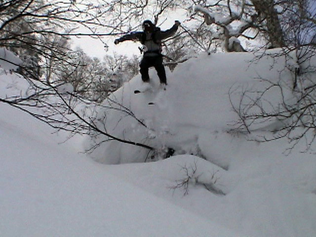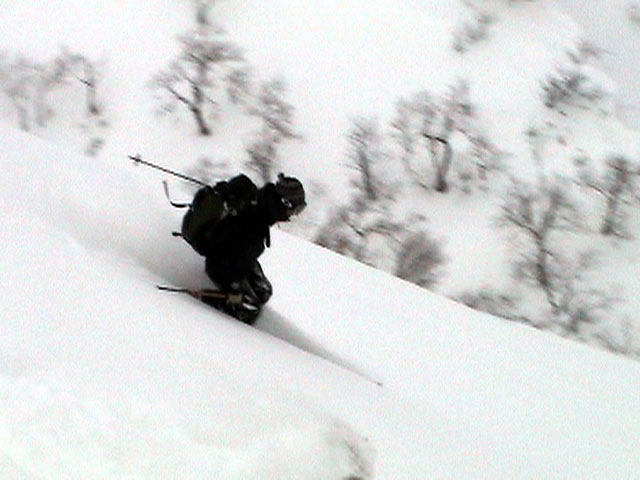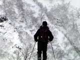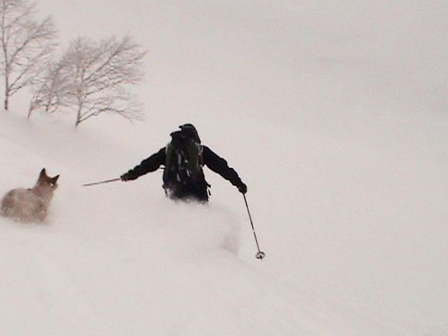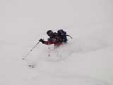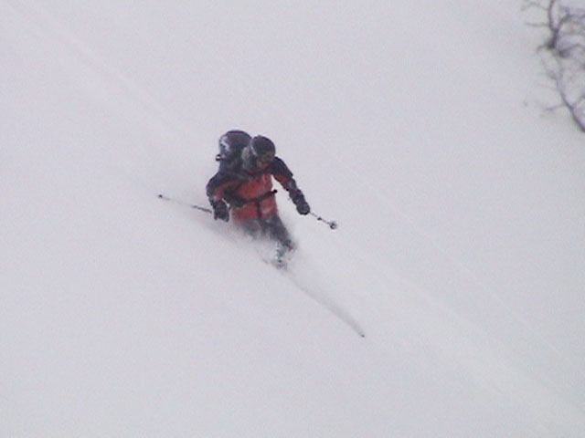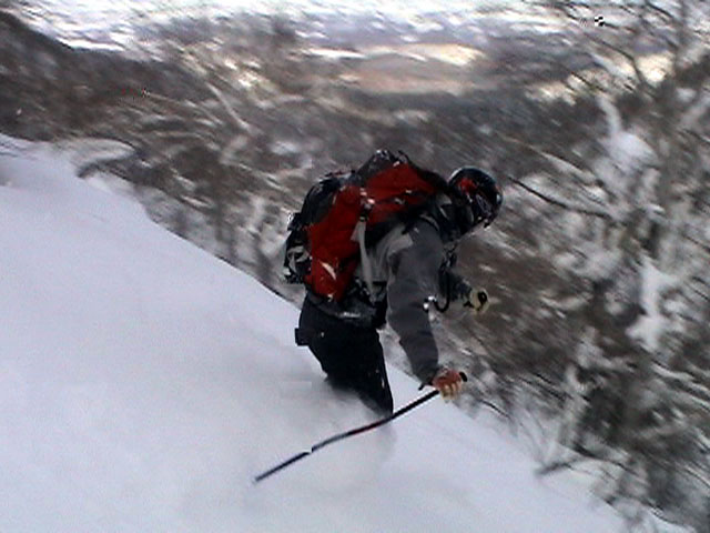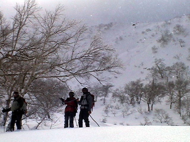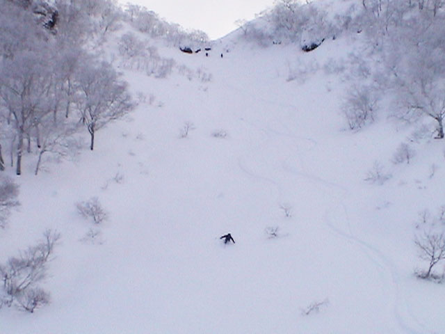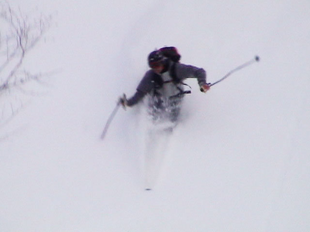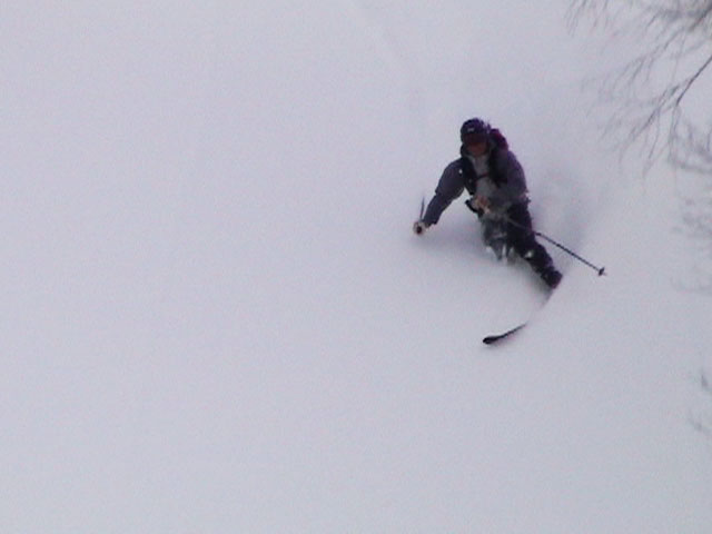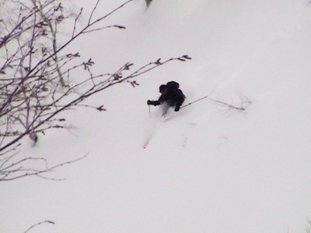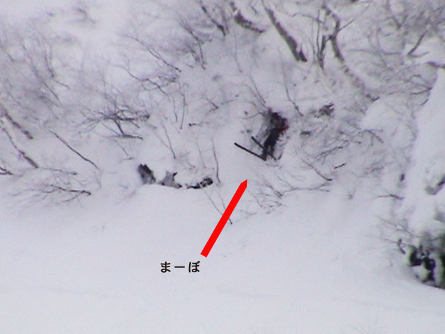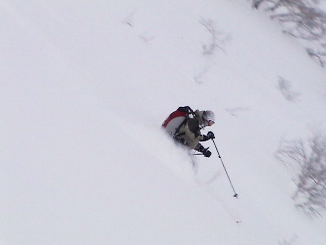 | 2004年2月1日(日) 三峰山スキーツアー(禁断の楽園) 危険!! 雪崩・急斜面 天気予報通り、ほぼ曇り。極希に薄日が差す天候。 前日に田中パパから「パウダーに対するモチベーションを保つために、明日はあえて上ホロをピッケルアイゼンで登ろうと思う・・」などと不穏な電話が入りハラハラしたが、うまいことに上ホロがガスに包まれ、共に三峰山のパウダーを喰いに行くことになった。 車をデポするために立ち寄ったバーデン上富良野前の駐車場は満車状態。もの凄い混み具合だ。 こちらで三段山クラブは三段山隊と三峰山隊の二隊に分かれた。 三峰山隊は、何時も通り凌雲閣の露天風呂横の沢を降り三峰山沢へ。 前回雪崩れた苦い教訓を生かして、何度も場所を変えて弱層試験を行った。 25センチにサンクラストによるものと思われる弱層があったが、比較的強く結合していたので旦那からドロップ!想像以上に素晴らしいパウダーだった。 かっちゃんは、別の斜面をスラフと共に滑り落ちたが、「今の滑りは納得できない!」とご立腹。何ターンかアルペンで逃げたことが許せないようだ。 まーぼはエントリーに失敗し、クリフの上の木に宙づり状態に!無線機からは「やばい〜死ぬ〜!」という悲痛な声が入るが、どうしようもない。「とっとと観念して落ちな!」などと冷たい返事をしていると、まさしくドロップして滑り落ちてきた。 こちらから、三峰山へ向かって登り返し。ガスがかかっている高度ギリギリまで上がって滑りを楽しむことにした。 滑降地点へ到着した時には、ガスっぽかったが、ドロップするときには奇跡的に晴れてきて気持ちよく滑ることができた。 よし!調子が出てきた。 再び三峰山沢へ、各自気に入った斜面を選びながら滑っていく。無線機で連絡を取り合っているので、この辺は融通が利いて助かる。 今度は、雌鹿ノ滝付近の壁へ登り返し。昨日イシバシさん達が滑り降りたホコ岩の東側シュートのシュプールが、良く見えた。 ここで旦那だけが斜面の途中へトラバースして入って、皆から見えない所で弱層試験を行った。 撮影準備が整い、無線でドロップの指示を出そうとしたら・・「ボム!プシュー」と雪崩エアバックが作動!カメラがトリガーハンドルに引っかかったらしい。 「えー、こちら旦那、雪崩エアバックが誤作動して開いていますが、気にしないで滑って下さい」「・・・了解」 皆、なるべくこちらを見ないようにして急斜面を滑っていく。唯一マーボだけがまともに旦那を見てしまい、爆笑してバランスを崩し爆裂転倒!いや、悪いことをした。 その後、雌鹿ノ滝の直下に集まった皆から大笑いされてしまった。二万円の一発芸。これだけ笑われたら元はとれたかも・・ 哀れな旦那はエアバックを膨らませたままバーデン上富良野へ・・うーん。高く付いたツアーになったが、新しい斜面を開拓できて良かった。 天候:曇り、極希に晴れ 風速:0〜5メートル 気温:-11度 雪量:十分 雪質:25〜30センチの軽いパウダー コース:凌雲閣〜三峰山沢〜三峰山テラス〜雌鹿ノ滝〜バーデン上富良野 メンバー:旦那、かっちゃん、まーぼー、なまこ、田中パパ、toshi 計6名 |