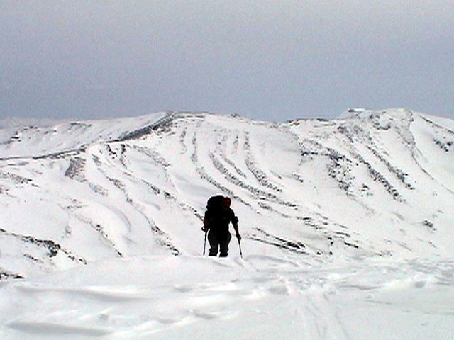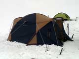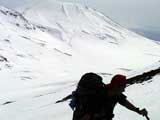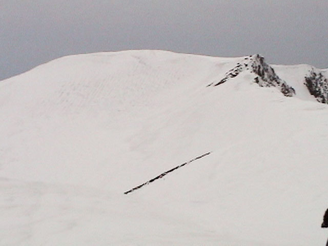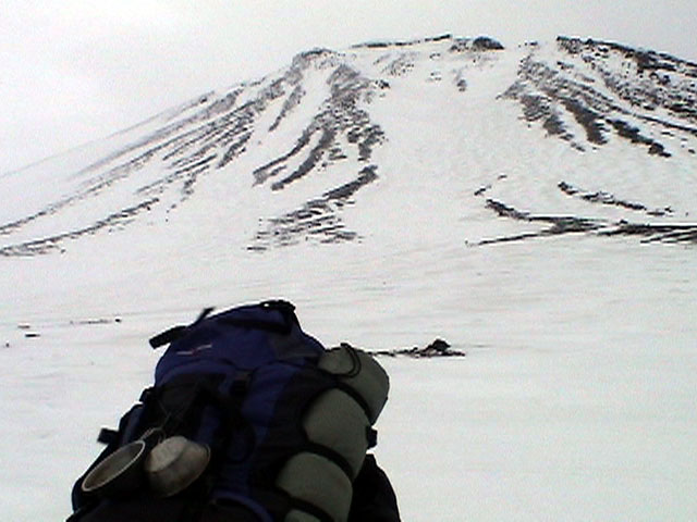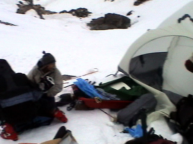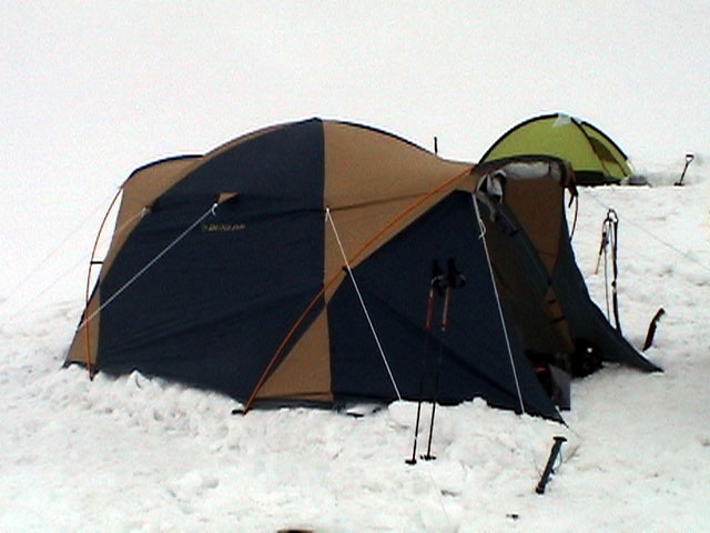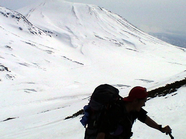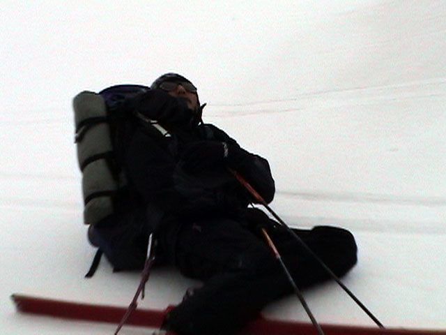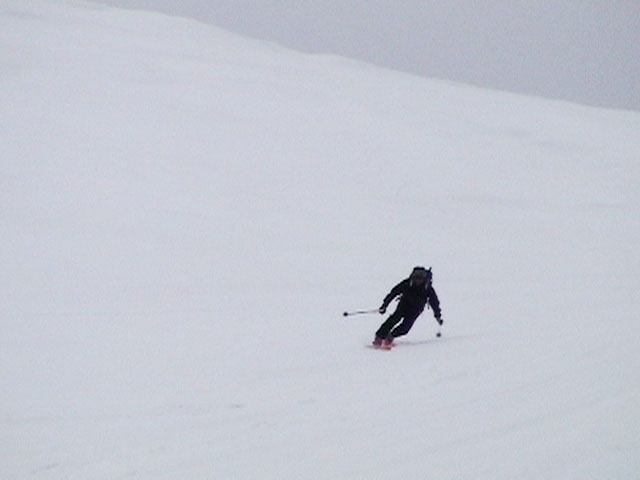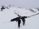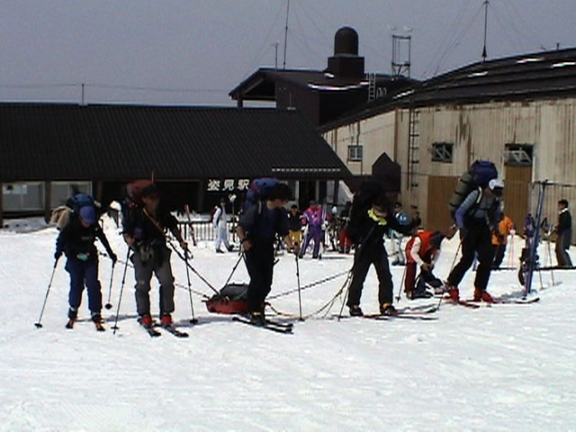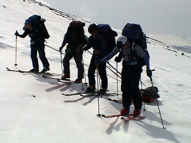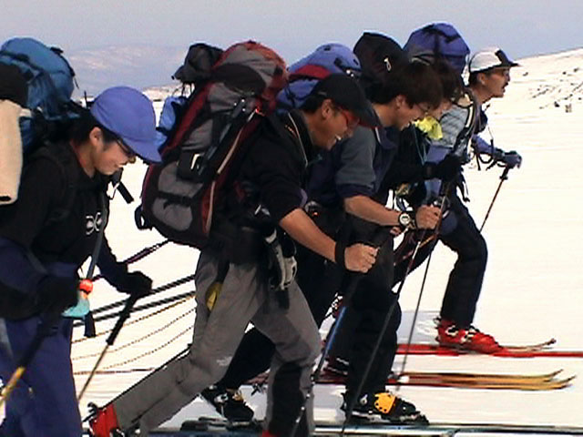 | 2004年5月2日(日)〜3日(月)憲法記念日 中岳温泉スキーツアー(強風地獄〜テント崩壊〜) 5月2日(日) 天候:晴れ後曇り 風速:無風 気温:0〜10度 雪量:例年より少な目 雪質:スーパーモナカ〜深ザラメ コース:旭岳温泉〜中岳温泉〜安足間岳〜比布岳〜中岳温泉 コースタイム: 9:00旭岳温泉〜9:30姿見駅〜11:40中岳温泉 中岳温泉12:47〜14:14安足間岳〜14:55比布岳〜16:03中岳温泉 メンバー:旦那、田中パパ、ゆうちゃん、ぱっちまん、かっちゃん、なまこちゃん 計6名 5月3日(月) 天候:曇り後雪 風速:25m 気温:-4度 雪量:例年より少な目 雪質:ウインドクラスト〜ハードバーン コース:中岳温泉〜旭岳温泉 コースタイム: 中岳温泉7:30〜9:16姿見駅10:34〜11:13旭岳温泉 三段山クラブ馬鹿行事として恒例となっていた中岳温泉ツアー。準備が面倒なので2001年以来中止されていたが、今シーズン急遽復活されることになった。馬鹿でかいオートキャンプ用ドームテントを大型ソリに積んでいき、中岳温泉で快適に過ごすというコンセプトのもので、例年快晴に恵まれて成功を収めていたツアーだったが・・ 天気予報は、5月2日は快晴無風。5月3日は曇りのち雨、風速5m。2日は問題ないが、3日は動けるとしても午前中だけで、あまり期待できない。たぶんすぐに撤収することなるだろうと思った。 5月2日、8時30分に旭岳温泉ロープウエイ駐車場に集合。このツアーを中止していた二年間の間に、すっかりメンバーの顔ぶれが変わってしまった。前回のツアーと同じメンバーは誰も居ない。なまこちゃんは初山中泊。そういえば、ゆきこの初山中泊も中岳温泉だった。 現在妊娠8ヶ月近くのゆきこは、自分が行けない分せめて食事当番をやるということで、一生懸命食材を準備してくれた。ありがとう。いつか生まれてくる子供達と一緒に行こう。 9時発のロープウエイ始発は混んでいた(臨時便が出たので、正確には第二便)。何名か知り合いに会えたのが嬉しかった。 姿見駅から見た旭岳は見事の一言に尽きる。地獄谷が「こっちを滑ろうよ〜」と呼んでいる。しかし僕らにはソリ引きが待っている。ソリは年々改良されて、クロスコントロールバー、ショックアブソーバーバンドなどを装備し、快適性は向上されているのだが、複数の人数で片斜面を何時間も引っ張るとなるとそれなりに辛い。特に精神面で「忍耐」「協調性」などが試される。 今回はさすがに精鋭メンバーだけあって、2時間10分という驚異的な時間で中岳温泉に到達できた。 ちなみに、2001年のツアーでは4時間30分もかかっている!お疲れ様。 明日は悪天候が予想されているので、たぶん今日しか滑れるチャンスは無い。 時間がもったいないので、中岳温泉に装備を置いた後、すぐに安足間岳方面に出発した。田中ファミリーは愛別岳のピークを狙う。 暑い!安足間岳の登りは暑さとの闘いだった。日差しと雪面の照り返しで熱中症になりそうだ。ヘロヘロになりながら安足間岳のピークに到着。体力に余裕のあるかっちゃんは軽ーく一本滑って登り返してきた。 田中ファミリーは愛別岳を目前にしながら、雪の状態が悪いという判断で苦渋の登頂中止。せっかくアイゼン、ピッケルを持ってきたのに残念だった。 雪の状態の良い所を探しながら比布岳のピークまで移動し。ピークから南面の大斜面を滑った。 しかし、ちょうど曇ってきて雪のギャップが見えづらくなり、さらに雪質が悪化してモナカ状態になってしまい難儀した。午前中なら快適なスキー滑降が楽しめただろう。残念だ。 足の肉離れが悪化した者や、転倒して軽傷を負った者を出しながら中岳温泉へ帰還。トイレとテントの設営作業を行った。 今回のツアーでは大便の他に、初めて小便の持ち帰りも行った。小便の量は多く重量がかさみ、持ち帰りには相当の負担がかかることが分かった。 中岳温泉では、他に5パーティほどが幕営していた。 その後の様子は、ぱっちまんのテレ三昧(BC日記)に詳しい。http://www.bc-qali.com/ テントについて、オートキャンプ用とはいえドーム型であり、何度か山中で使用しても問題が無かったので、風速15mくらいまでなら耐えられると思っていた。 前日の旭岳温泉のスポット天気予報では3日の風速が5mとのことだったので、中岳温泉でもせいぜい15m程度の風に収まると思ったのだが・・ 5月3日 予想よりも早く天候が悪化し、特に2日の夜半から猛烈な風が吹き始めた。テントが大きな音をたてながらほとんど潰れるような状態を何度も繰り返し、とても眠れるような状態ではない。外張りを何度か修繕しながら一晩耐えたが、とうとう明け方に貼り綱が切れてしまい、テントが一気に崩壊した。 ポールが曲がり、テント地がちぎれ、いくつか装備が吹き飛ばされる中、メンバーが交代で潰れたテントを支え、その間に残りのメンバーが大急ぎで身支度を調えた。 旦那はナイフを振るって、テントの一部を裂きながら撤収作業を行った。もうこのテントは使えない。結婚祝いで友人達が贈ってくれたものなので