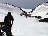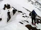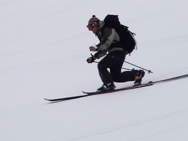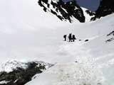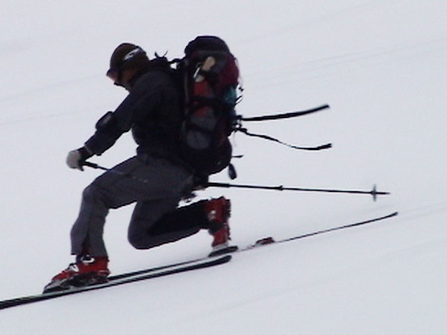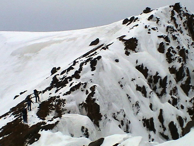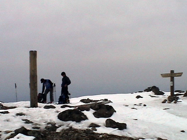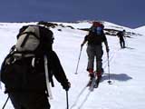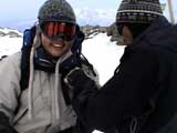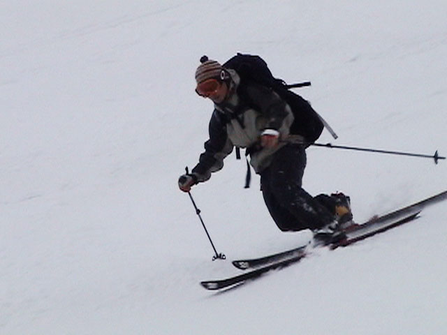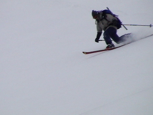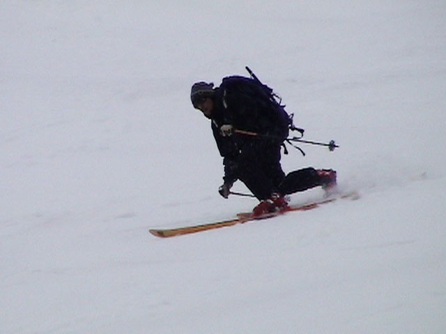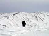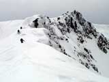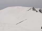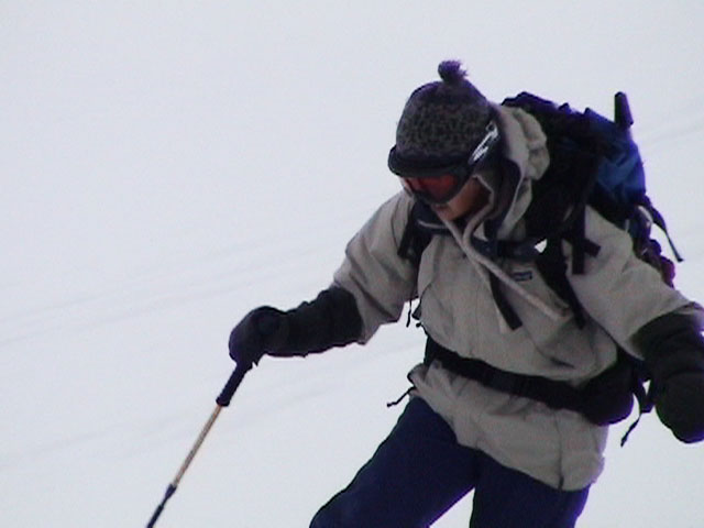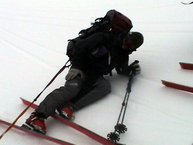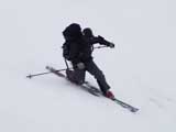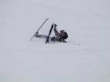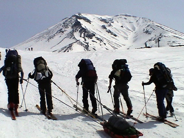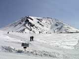 | 2004年5月2日(日)〜3日(月)憲法記念日 中岳温泉スキーツアー(強風地獄〜テント崩壊〜) 5月2日(日) 天候:晴れ後曇り 風速:無風 気温:0〜10度 雪量:例年より少な目 雪質:スーパーモナカ〜深ザラメ コース:旭岳温泉〜中岳温泉〜安足間岳〜比布岳〜中岳温泉 コースタイム: 9:00旭岳温泉〜9:30姿見駅〜11:40中岳温泉 中岳温泉12:47〜14:14安足間岳〜14:55比布岳〜16:03中岳温泉 メンバー:旦那、田中パパ、ゆうちゃん、ぱっちまん、かっちゃん、なまこちゃん 計6名 5月3日(月) 天候:曇り後雪 風速:25m 気温:-4度 雪量:例年より少な目 雪質:ウインドクラスト〜ハードバーン コース:中岳温泉〜旭岳温泉 コースタイム: 中岳温泉7:30〜9:16姿見駅10:34〜11:13旭岳温泉 三段山クラブ馬鹿行事として恒例となっていた中岳温泉ツアー。準備が面倒なので2001年以来中止されていたが、今シーズン急遽復活されることになった。馬鹿でかいオートキャンプ用ドームテントを大型ソリに積んでいき、中岳温泉で快適に過ごすというコンセプトのもので、例年快晴に恵まれて成功を収めていたツアーだったが・・ 天気予報は、5月2日は快晴無風。5月3日は曇りのち雨、風速5m。2日は問題ないが、3日は動けるとしても午前中だけで、あまり期待できない。たぶんすぐに撤収することなるだろうと思った。 5月2日、8時30分に旭岳温泉ロープウエイ駐車場に集合。このツアーを中止していた二年間の間に、すっかりメンバーの顔ぶれが変わってしまった。前回のツアーと同じメンバーは誰も居ない。なまこちゃんは初山中泊。そういえば、ゆきこの初山中泊も中岳温泉だった。 現在妊娠8ヶ月近くのゆきこは、自分が行けない分せめて食事当番をやるということで、一生懸命食材を準備してくれた。ありがとう。いつか生まれてくる子供達と一緒に行こう。 9時発のロープウエイ始発は混んでいた(臨時便が出たので、正確には第二便)。何名か知り合いに会えたのが嬉しかった。 姿見駅から見た旭岳は見事の一言に尽きる。地獄谷が「こっちを滑ろうよ〜」と呼んでいる。しかし僕らにはソリ引きが待っている。ソリは年々改良されて、クロスコントロールバー、ショックアブソーバーバンドなどを装備し、快適性は向上されているのだが、複数の人数で片斜面を何時間も引っ張るとなるとそれなりに辛い。特に精神面で「忍耐」「協調性」などが試される。 今回はさすがに精鋭メンバーだけあって、2時間10分という驚異的な時間で中岳温泉に到達できた。 ちなみに、2001年のツアーでは4時間30分もかかっている!お疲れ様。 明日は悪天候が予想されているので、たぶん今日しか滑れるチャンスは無い。 時間がもったいないので、中岳温泉に装備を置いた後、すぐに安足間岳方面に出発した。田中ファミリーは愛別岳のピークを狙う。 暑い!安足間岳の登りは暑さとの闘いだった。日差しと雪面の照り返しで熱中症になりそうだ。ヘロヘロになりながら安足間岳のピークに到着。体力に余裕のあるかっちゃんは軽ーく一本滑って登り返してきた。 田中ファミリーは愛別岳を目前にしながら、雪の状態が悪いという判断で苦渋の登頂中止。せっかくアイゼン、ピッケルを持ってきたのに残念だった。 雪の状態の良い所を探しながら比布岳のピークまで移動し。ピークから南面の大斜面を滑った。 しかし、ちょうど曇ってきて雪のギャップが見えづらくなり、さらに雪質が悪化してモナカ状態になってしまい難儀した。午前中なら快適なスキー滑降が楽しめただろう。残念だ。 足の肉離れが悪化した者や、転倒して軽傷を負った者を出しながら中岳温泉へ帰還。トイレとテントの設営作業を行った。 今回のツアーでは大便の他に、初めて小便の持ち帰りも行った。小便の量は多く重量がかさみ、持ち帰りには相当の負担がかかることが分かった。 中岳温泉では、他に5パーティほどが幕営していた。 その後の様子は、ぱっちまんのテレ三昧(BC日記)に詳しい。http://www.bc-qali.com/ テントについて、オートキャンプ用とはいえドーム型であり、何度か山中で使用しても問題が無かったので、風速15mくらいまでなら耐えられると思っていた。 前日の旭岳温泉のスポット天気予報では3日の風速が5mとのことだったので、中岳温泉でもせいぜい15m程度の風に収まると思ったのだが・・ 5月3日 予想よりも早く天候が悪化し、特に2日の夜半から猛烈な風が吹き始めた。テントが大きな音をたてながらほとんど潰れるような状態を何度も繰り返し、とても眠れるような状態ではない。外張りを何度か修繕しながら一晩耐えたが、とうとう明け方に貼り綱が切れてしまい、テントが一気に崩壊した。 ポールが曲がり、テント地がちぎれ、いくつか装備が吹き飛ばされる中、メンバーが交代で潰れたテントを支え、その間に残りのメンバーが大急ぎで身支度を調えた。 旦那はナイフを振るって、テントの一部を裂きながら撤収作業を行った。もうこのテントは使えない。結婚祝いで友人達が贈ってくれたものなので