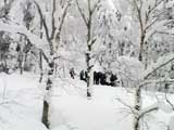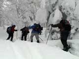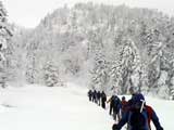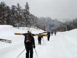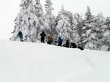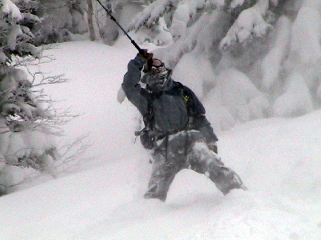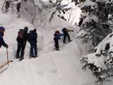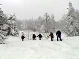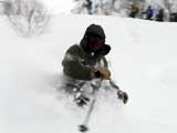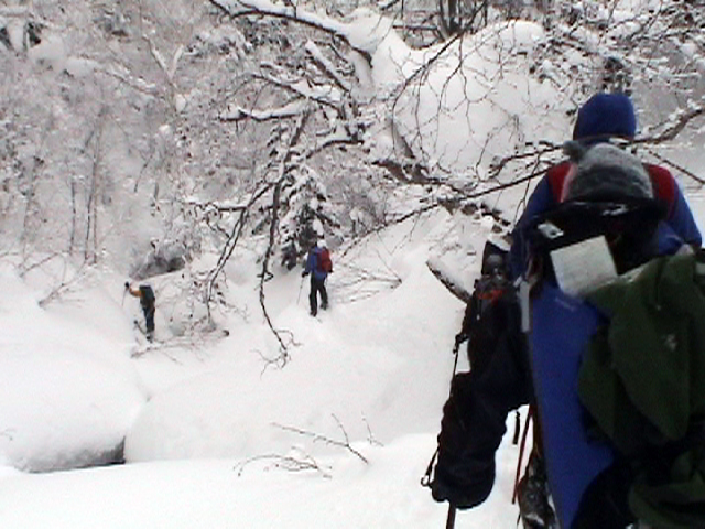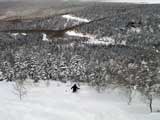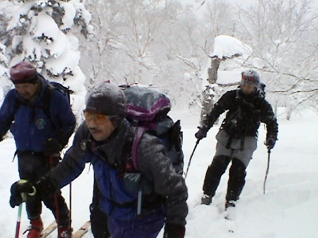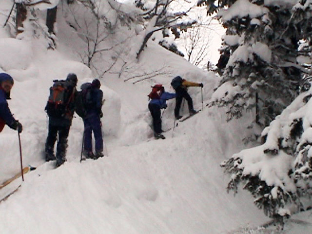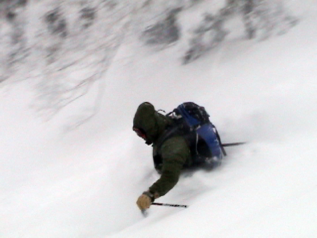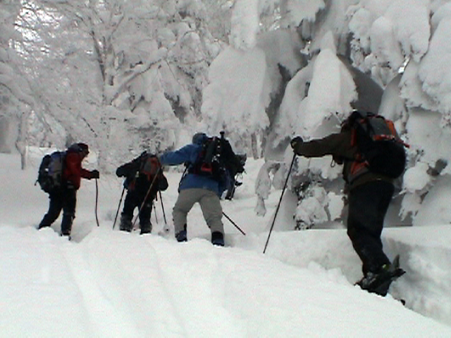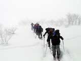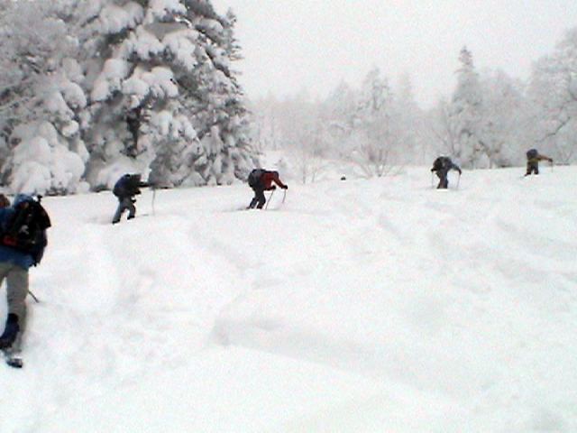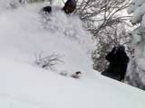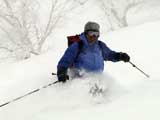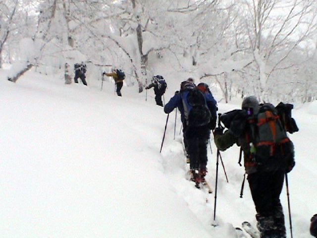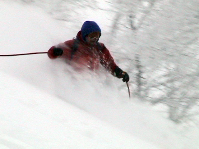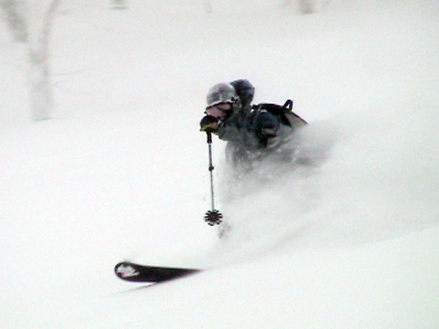 | 2005年2月12日(土) 富良野岳qaliスキーツアー(KIWI&ATCスポーツさんたちツアー) 今回のツアーは、ぱっちまんのqaliツアーのお手伝い。 ぱっちまんが当初予定していたアシスタントの都合が悪くなったので、ピンチヒッターとして(風呂とビールをおごってもらうという条件で)、旦那がアシスタント&ビデオカメラマンとして同行することになった。 前日の富良野岳は大盛況だったようで、今日はどの斜面もズタズタ。しかも、折からの強風で森林限界より上ではウインドパック気味。樹林帯の雪も深くて重い。 視界も悪いので、これではベベルイ沢方面を滑るのは難しそうだ・・ しかし、そこはぱっちまん。蛇の道は蛇で、あまり荒らされていなくて雪も比較的良さそうな秘蔵ルートへと案内してくれる。 弱層テストをして安全を確認してから、木々に隠されたオープンバーンへ思いっきり飛び込んだ。 やっぱり雪は重めだったが、ツアーメンバーは皆レベルが高く、平気で深雪を楽しんでいた。「この雪なら、全然重くないですよ」との事。凄い。 店長さんをはじめ楽しい方ばかりで、常に笑い声が絶えない。 三段山クラブと似た雰囲気のツアーに、旦那もついアシスタントという立場を忘れて、すっかり楽しんでしまった。 同行していたRescue3Japanの阿部恭浩さんの話も大変面白く、話題は子供の扱いから(^_^)レスキュー法まで多岐にわたった。 ツアー後には、KIWI&ATCスポーツ合宿所へ乱入。豪華な食事ごちそうさまでした。 天候:雪のち曇り時々晴れ 風速:0〜5メートル 気温:-15度 雪量:十分 雪質:森林限界より上はウインドパック気味〜その他は重めのパウダー コース:富良野岳ジャイアント尾根 メンバー:ぱっちまん(CL)、阿部さん(SL)、旦那(SL)、KIWI&ATCスポーツさんたち計11名 |