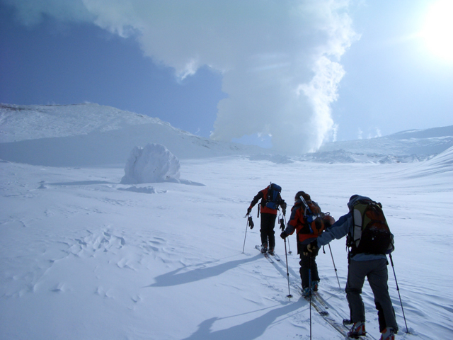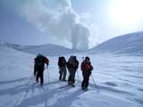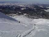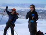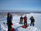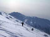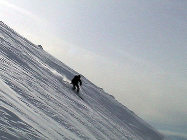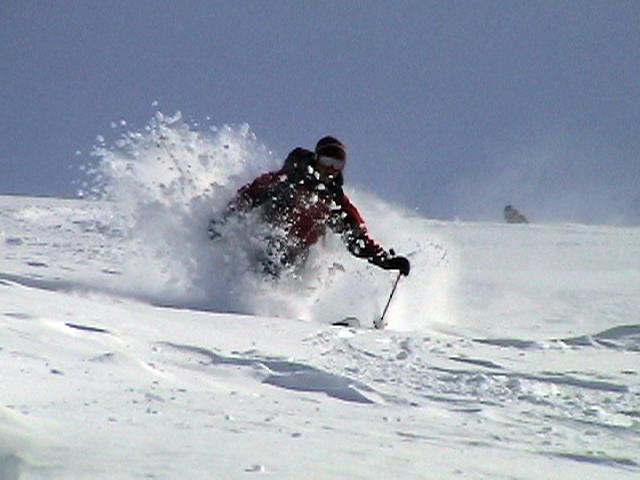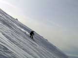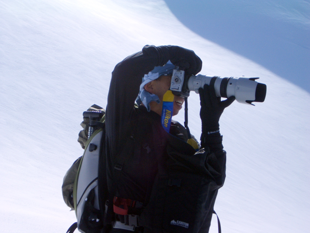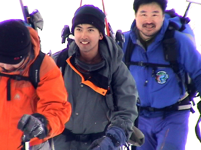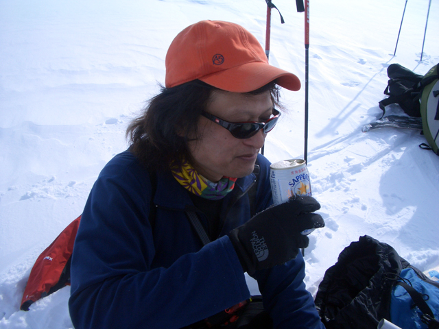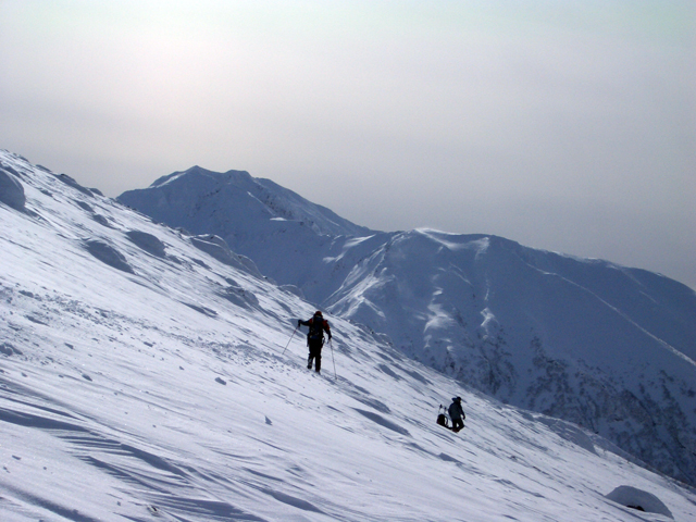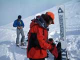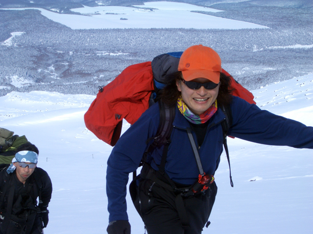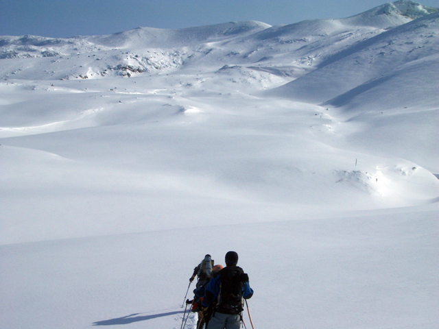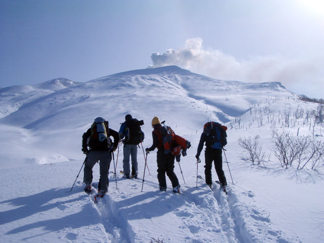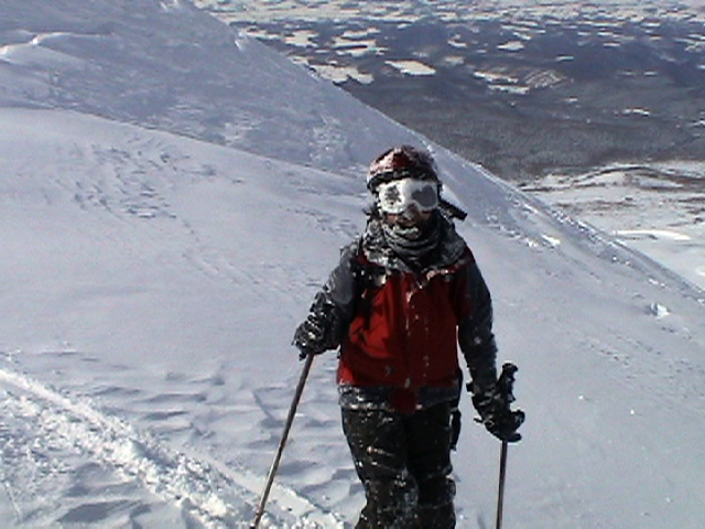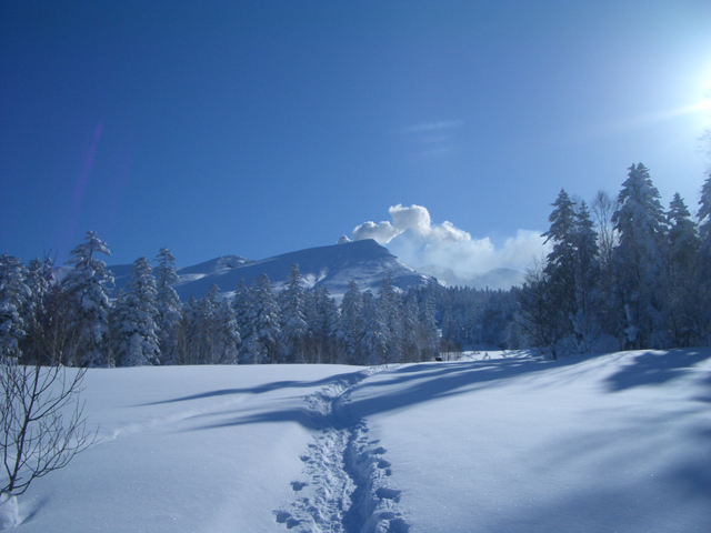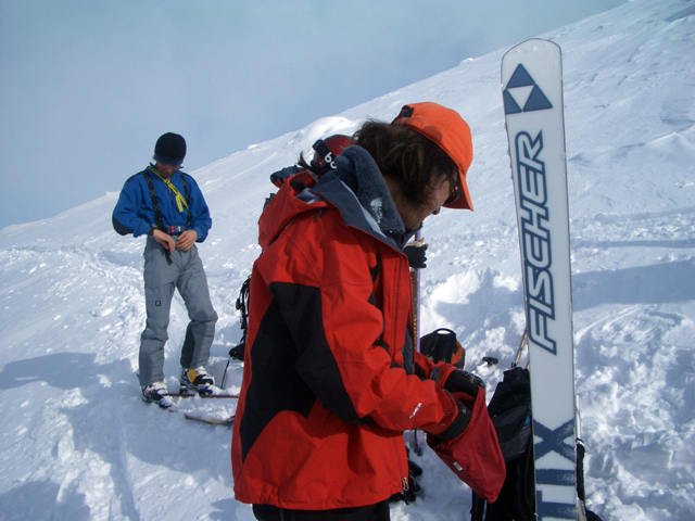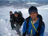| 2005年2月16日(水) 危険!前十勝スキーツアー(かくも美しく平和で危険な山) 天候:快晴 風速:0〜1メートル 気温:-14度 雪量:十分だが、薄いパウダーの下に岩が多数あり。危険 雪質:上部はウインドパック気味〜その他は重めのパウダー コース:白銀荘〜前十勝 メンバー:旦那、ぱっちまん、かっちゃん、堀田さん、佐藤さん、ゆりちゃん 計6名 今回のツアーは、以前に「おでん屋えとり」で一緒に飲んだことのある堀田 貴之氏から、「今度一緒に山へ行きませんか?」とのお誘いを受けたのがきっかけだった。予定された日が平日だったので、職場の休みをとったりして準備していたのだが、なかなか堀田さんから連絡が来ない。 やっと前日の夜に電話で、堀田さんの他にカメラマンの佐藤さん、美人モデル(ゆりちゃん)が参加するのでよろしくと告げられた。 美人モデル?初耳だ。いったいなんの取材なんだろ?まぁそんな細かいことは気にしない三段山クラブなので、こちら側はぱっちまんとかっちゃんに応援を頼んで(二人に多謝!)、いつも通り白銀荘に集合とした。 行き先は三段山を予定していたが、堀田さんはすでに川上さんと快晴の三段山に登ったことがあるようなので、前十勝か富良野岳のどちらかを登ることにして、当日に現地で判断することにした。 |