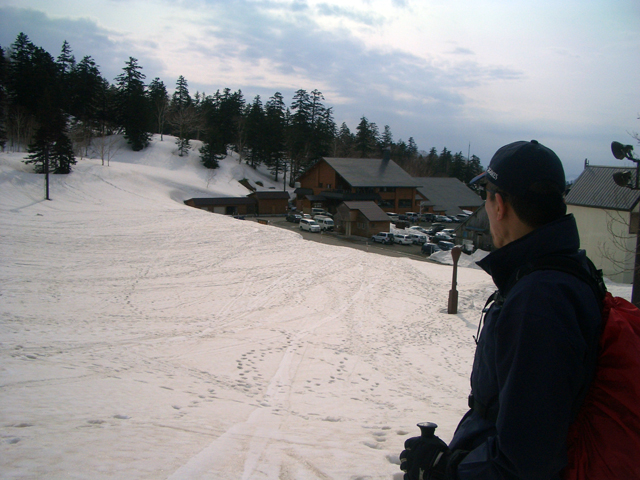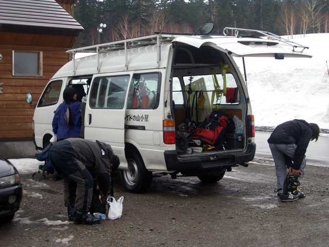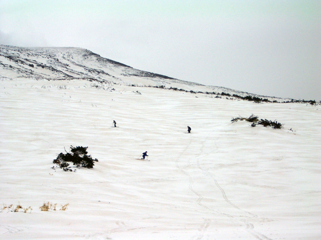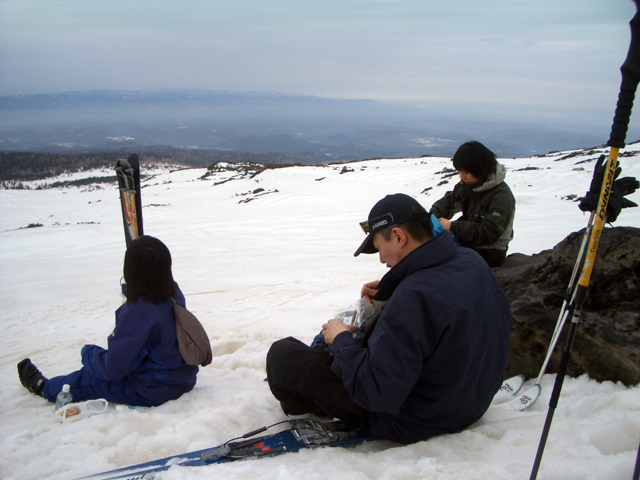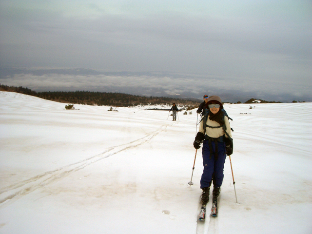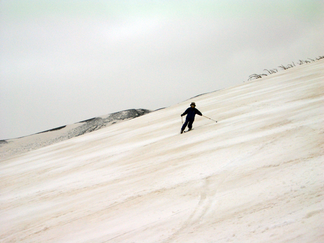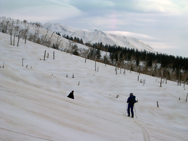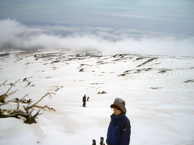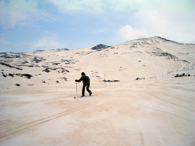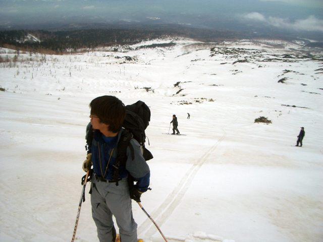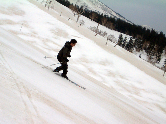 | 2005年5月1日(日) 前十勝スキーツアー(こんにちわ黄砂ーガイドの山小屋ツアーお手伝い) 天候:雨〜曇り 風速:0〜3メートル 気温:3〜9度 雪量:十分だが岩に注意 雪質:柔らかめのザラメ 黄砂あり コース:白銀荘〜千春沢付近〜白銀荘 メンバー:かっちゃん(ガイド)、旦那(サポート)、お客さん4名 計6名 今日は、ガイドの山小屋ツアーのお手伝い。恐らく、旦那にとってGW中唯一のツアー。 天気は朝から強い雨で山は分厚い雲に覆われていた。 しかし、白銀荘到着と共に視界が開けてきて、時々小雨の降る中快適なスキーツアーを楽しむことができた。 山は実際に行ってみないと分からないものだ。 残念ながら昨日黄砂が降って、滑りづらい所もあるが、雪自体はたっぷりとある。 白銀荘前のキャンプ場にも1〜2メートルは積もっている。今シーズンは長くスキーが楽しめると思う。 |