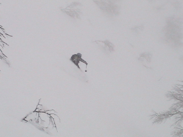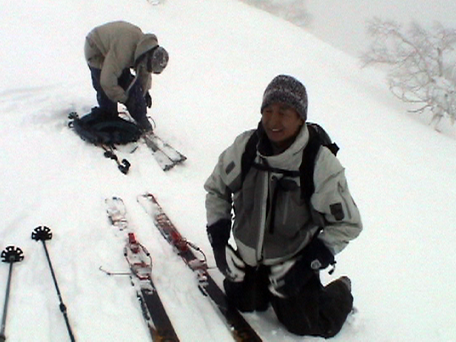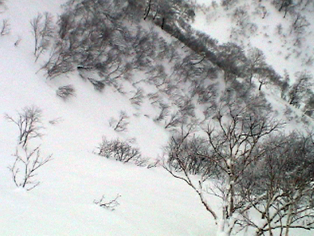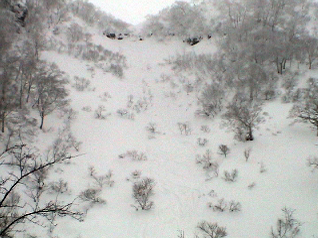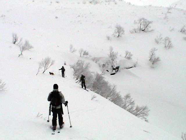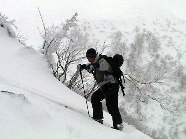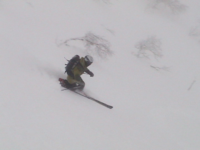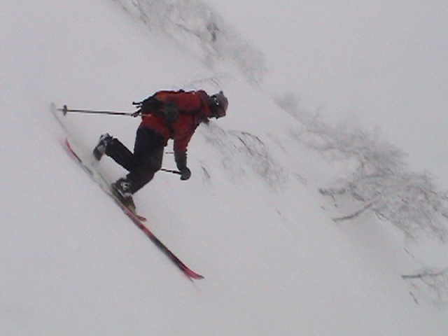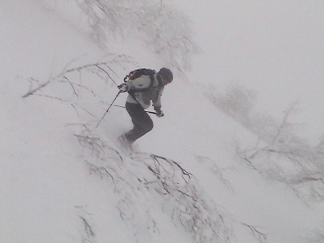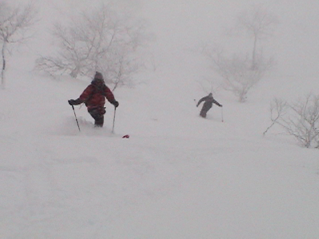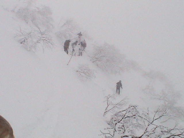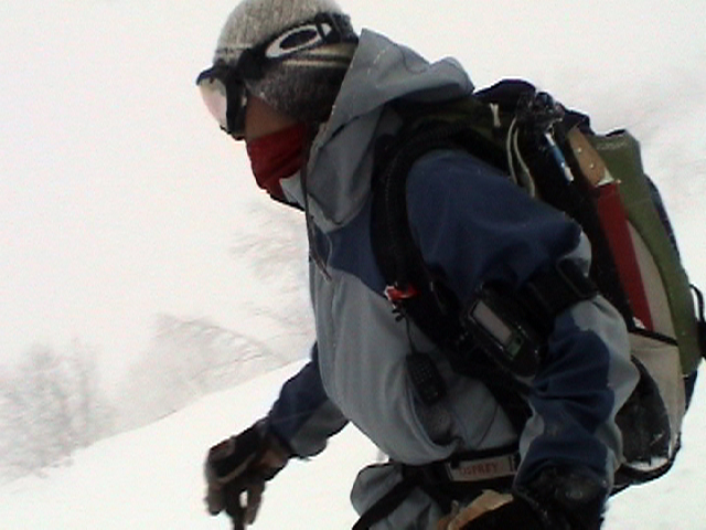 | 2006年12月24日(土) 三峰山Qaliスキーツアー( ホワイトアウトクリスマス!?) 今回のツアーは、KENさん(アバランチボールの人)がQaliのツアーに参加するということで、以前からKENさんと会いたいと思っていた旦那がぱっちまんに無理を言って、ツアーヘルパーとして参加させていただいたもの。 KENさんには、しっかりアバランチボールを見せてもらいました。恐らく旦那のABSもKENさんのアバランチボールも、日本で買った人は一人だけだと思います(^_^)。これは凄いことだと思う。 実際に見たアバランチボールは、思ったよりも複雑な機構で驚きました。展開は簡単ですが、折りたたむのは結構大変です。アバランチボールは展開すると、色といい形といいほおづきそっくりでプリティ。うーん、旦那も欲しくなりました(^_^)。 天候:曇りのち雪 上部は視界不良気味 |