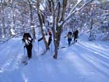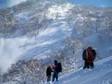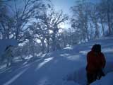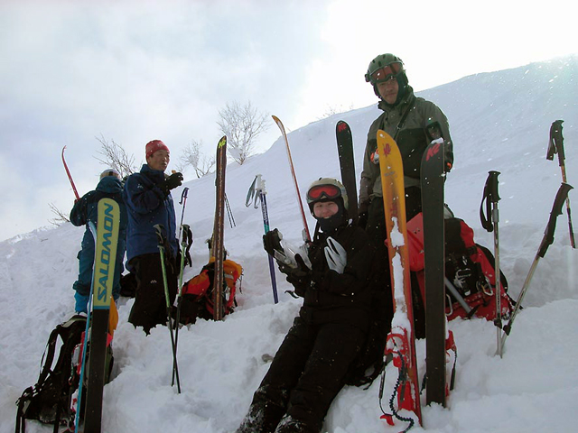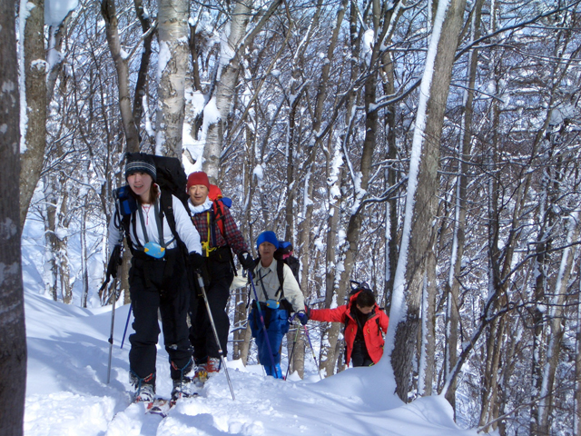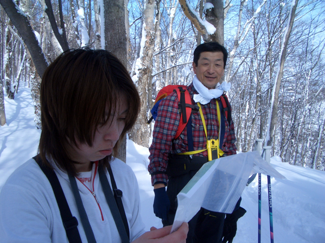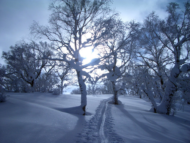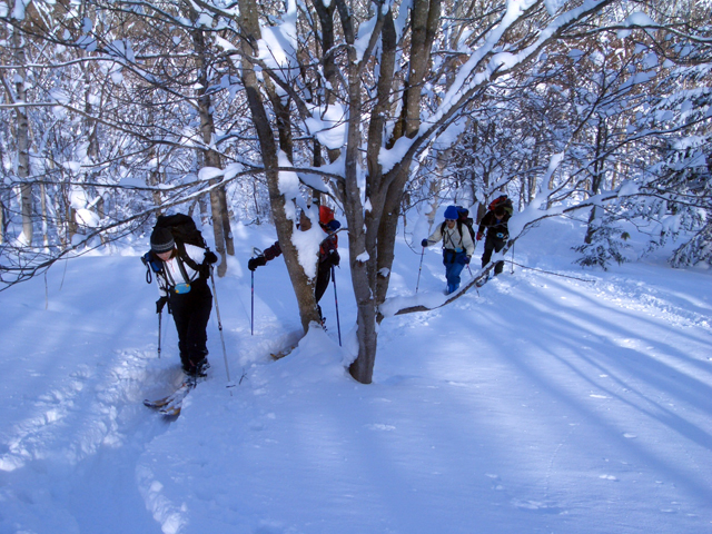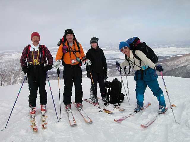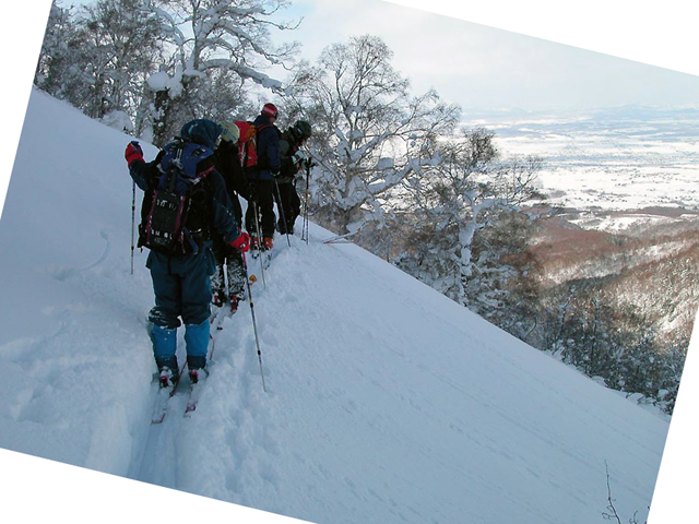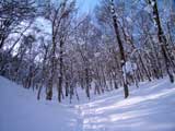 | 2006年2月4日(土) 音江山スキーツアー( 改めて樹林帯の美しさに感動) 天候:晴れ時々曇り 気温:-9度 風速:0〜2m 雪量:十分 雪質:少し締まり気味20〜30センチ程度のパウダー 北斜面へ少し下がった所で行ったコンプレッションテストの結果、顕著な弱層無し コース:沖里河温泉(10:24)〜(12:15)音江山(12:20)〜(13:48)沖里河温泉 メンバー:旦那、ゆきこ、Kinpeiさん、Wさん、Nさん 計5名 トラックログ図(登りのみ)今日は、前回同様に職場の仲間とのスキーツアー。 十勝山系の雪がワヤだという情報を得ていたので、音江山に入ってみた。 結果は、天候、雪質共にビンゴ!気持ちよく登り、気持ちよく滑ることができた。 |