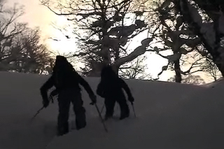滑り終えると、谷底から尾根へ向かって30〜40度の斜度を直登する。場所によっては膝くらいの深さの雪をラッセルする。確かにきついし、登りの最中でも雪崩のリスクが気になる。