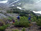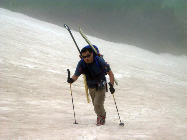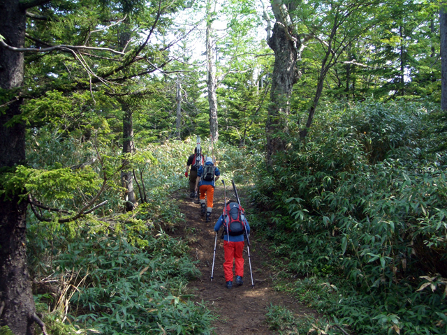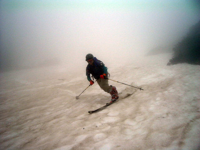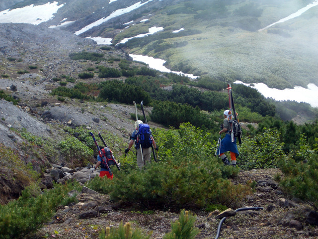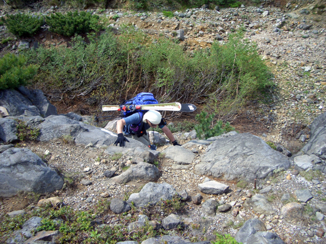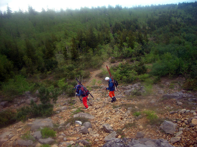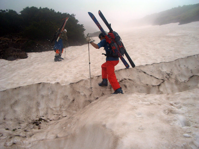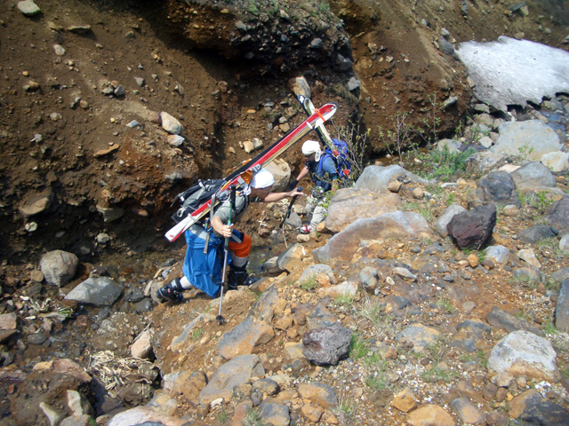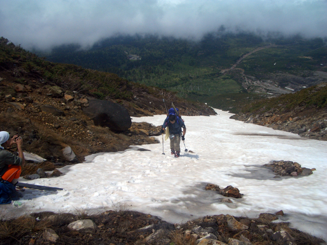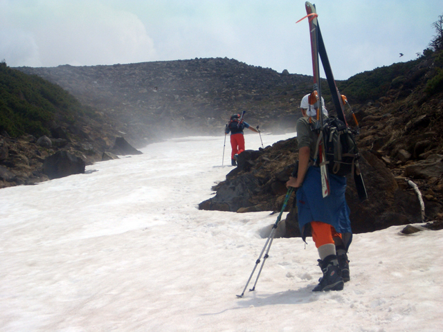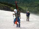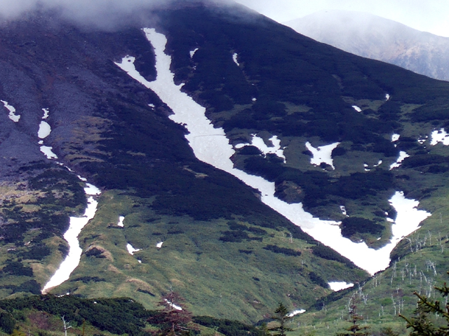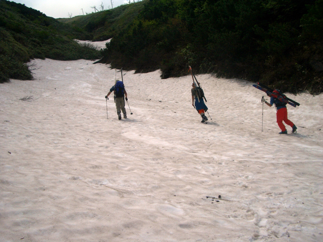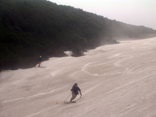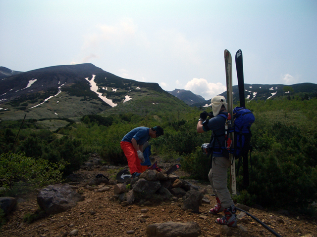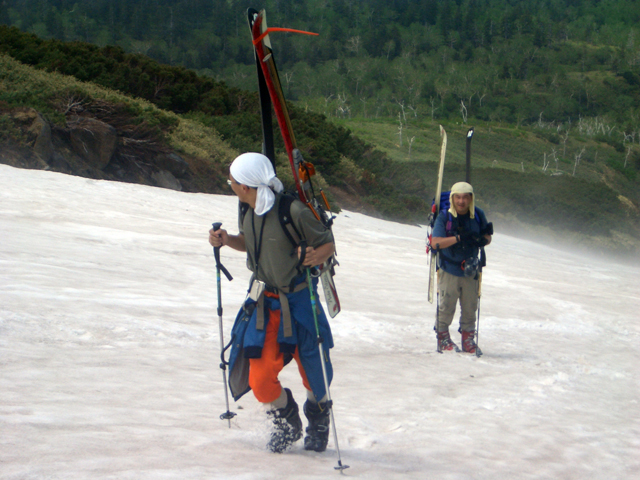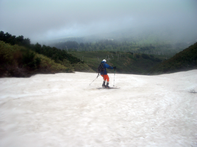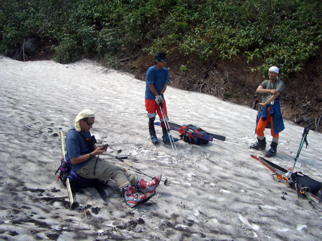 | 2006年6月20日(火) 前十勝スキーツアー( 千春沢ラストラン) 当初、この日の林道開通に合わせて赤岳スキーツアーを企画していたのだが、開通時間が11時と聞いてやる気半減。大雪高原温泉から入って高根ヶ原の雪渓を滑ろうと思ったら、まだ山開き前なので入山できないという。ふーむ。 悩んでいたら、今時期は前十勝の千春沢が良いらしいという話を耳にした。18日に偵察してみると、確かに良さげ(写真1,2参照)。ここはローカルらしく、最後のスキーも十勝山系で締めることにした。 BBSで参加者を募ったところ、SHIBAさんが参加してくれることになった。