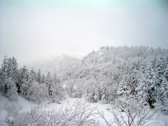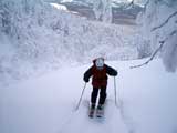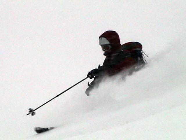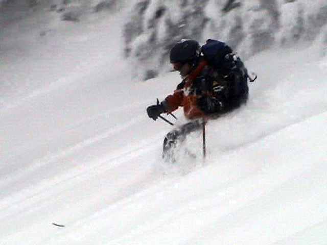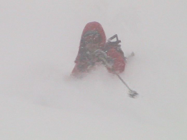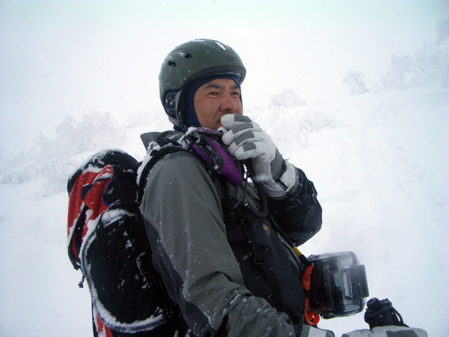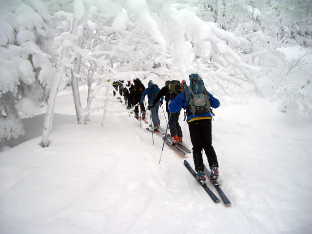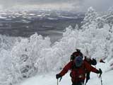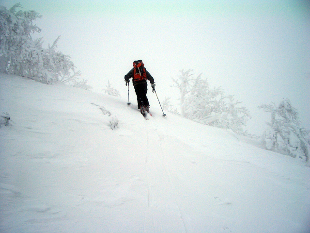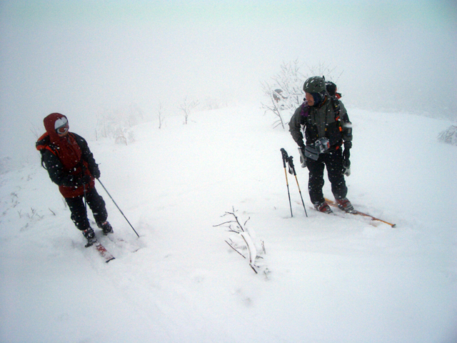 ここは一番滑降が楽しめると期待していたのだが、あいにくと視界が悪かった。トラバースしながら滑降ラインを変えてみるが、斜面の下部はまだブッシュが濃い。