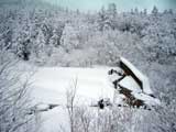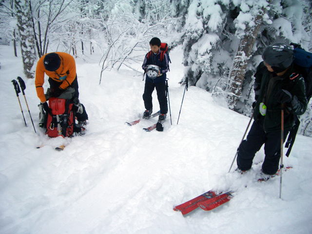そのまま登ったルートに合流して帰る予定だったが、北尾根に上がるトレースを見つけて、つい北尾根TGR付近を降りてしまった。斜度は50度くらいだったろうか。滑るというよりも落下する感じで滑降終了。正規のTGRはまだまだブッシュが濃いそうだ(田中パパ情報)。