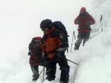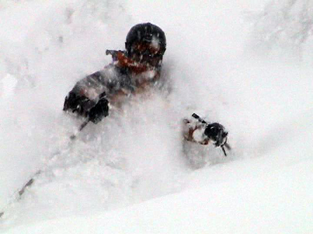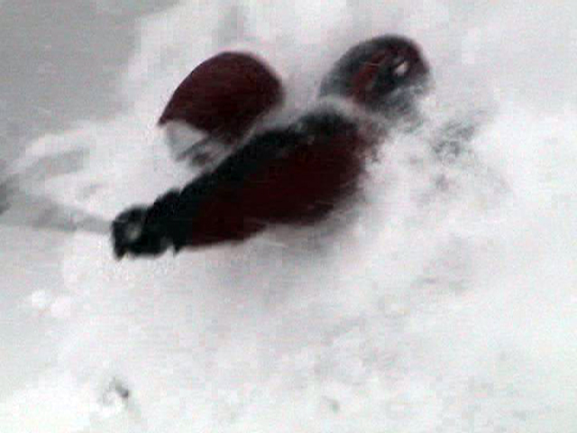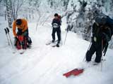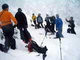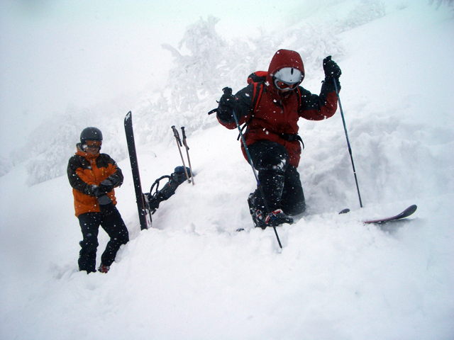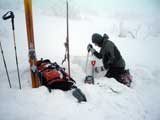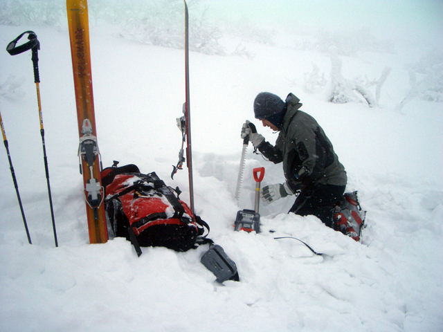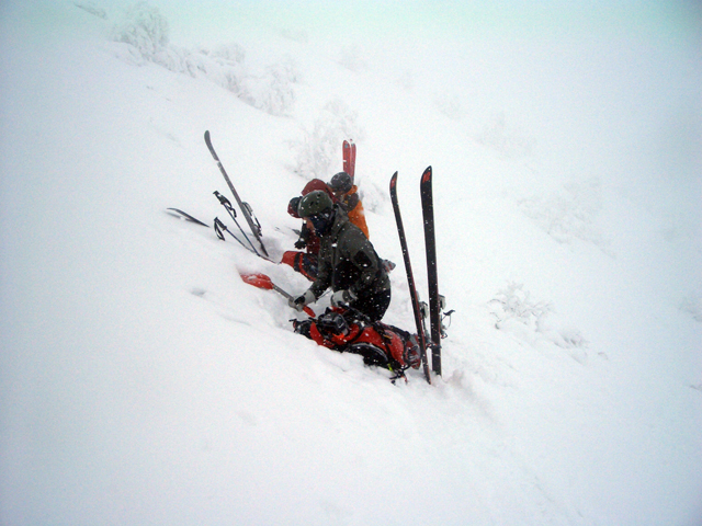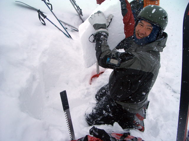 ベベルイ沢上部のピットチェックの結果は、グリーンライト。シャベルコンプレッションテストで肩の関節を使ったときに70〜80センチ下で破断。途中にかなり固い層が何層もあり、シャベルが刺さりづらいほどだった。
