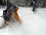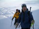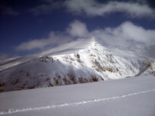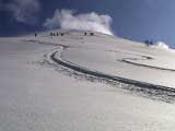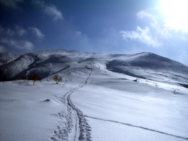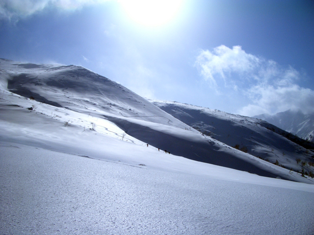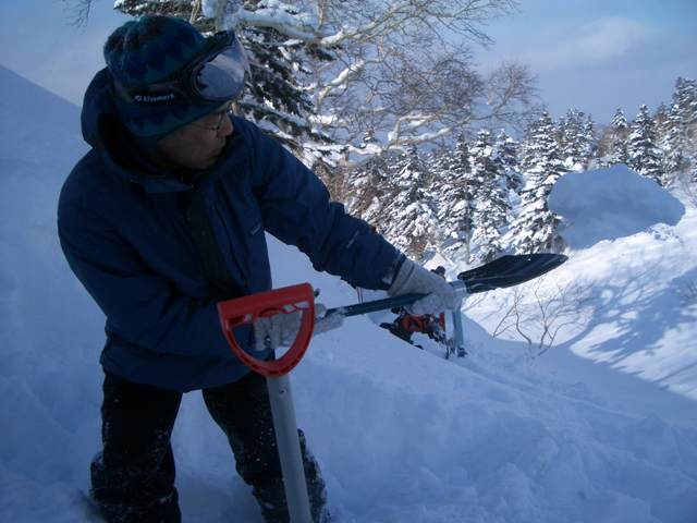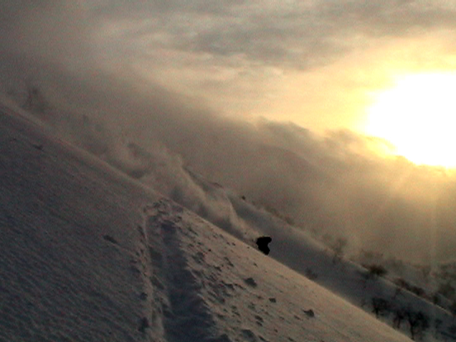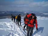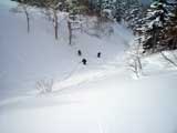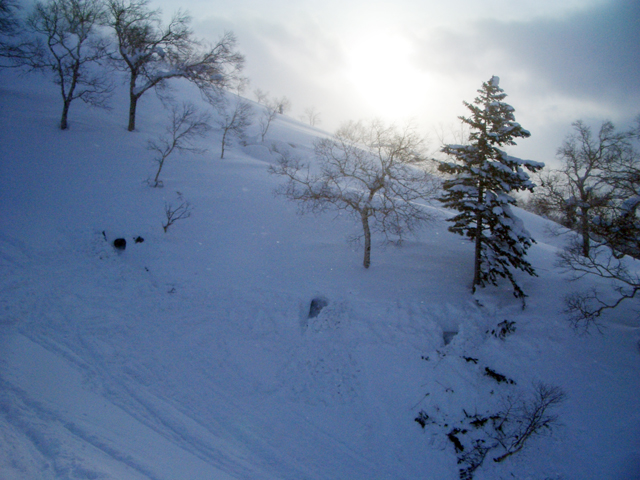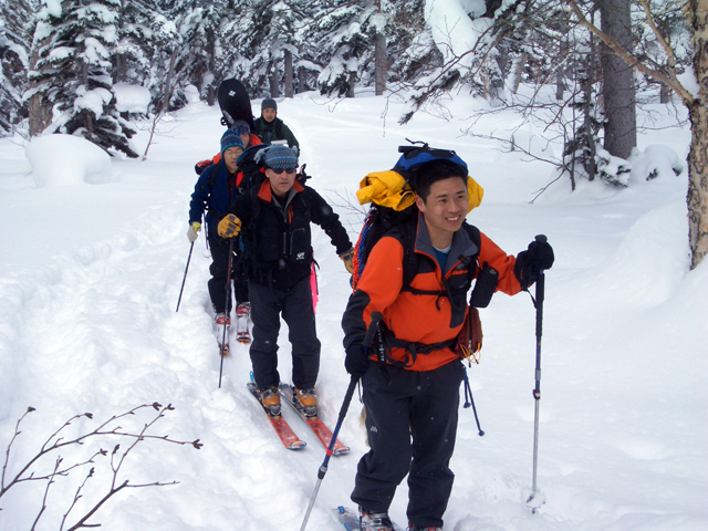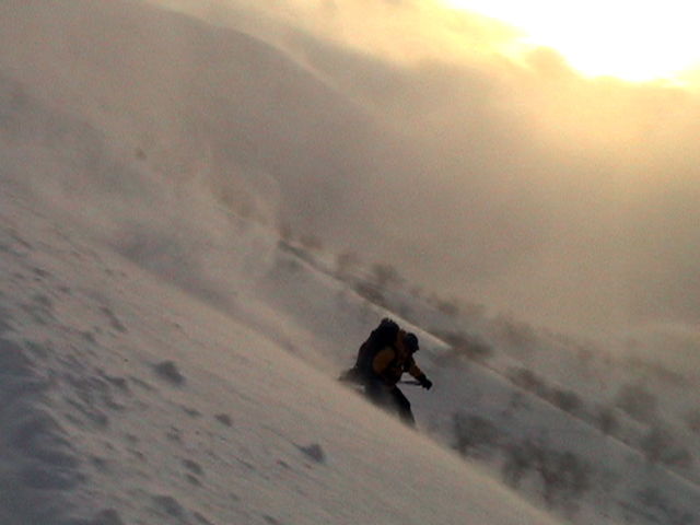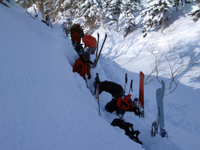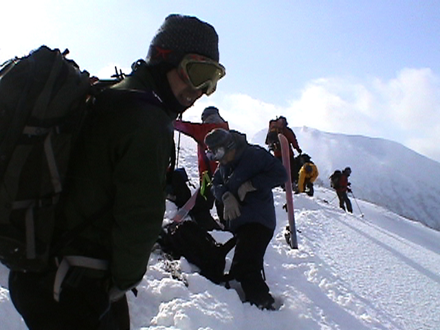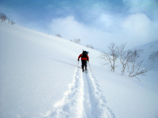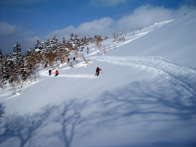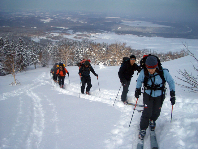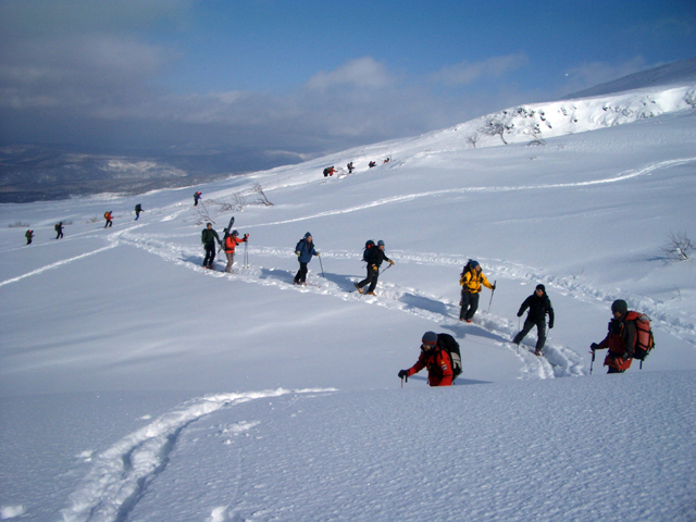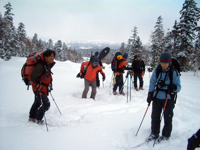 天候:曇りのち時々晴れ 気温:-10〜-5度 風:0〜10m 雪質:ハードバーンの上に10〜30センチ程度のパウダー 一部ウィンドパック コース:白銀荘(10:45)〜三段山西尾根〜(16:10)白銀荘 メンバー:ガイドの山小屋さん、旦那、スー、キャプテン、しょうタロさん、だあさん、guroさん、sherpaさん、スギさん(順不同) 計9名