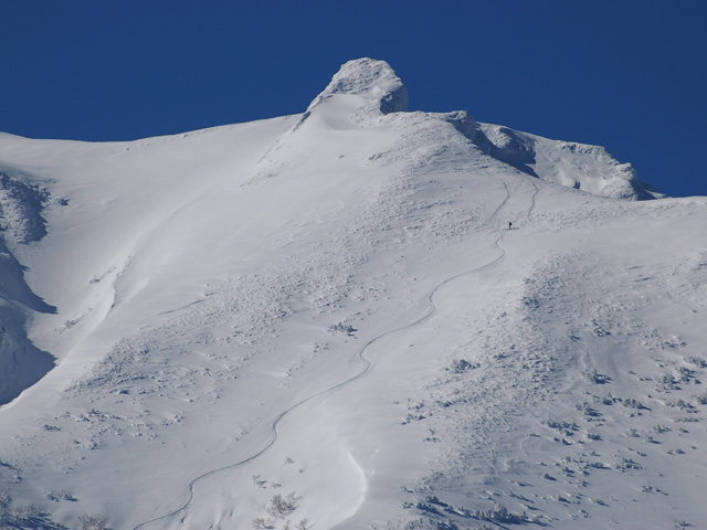 ![]() ホコ岩直下はシュカブラが多いので、少し北尾根よりに高度を下げてエントリーする |