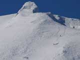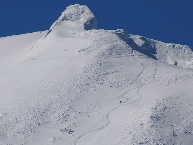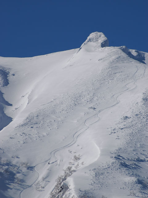 ![]() 核心部でもまったくスピードを緩めない。 パウダーの尾を長く引きながら滑降していく様子は壮観だ |