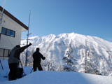![]() うらっち滑降準備 当然、核心部のかっちゃんの滑降の様子は上部からはまったく見えない。 かっちゃんから無線で、シュートのコンディションが伝えられる |