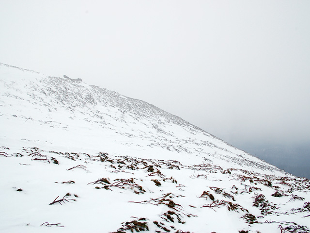 森林限界より上の雪はすっかり飛ばされて、ハイ松がたくさん顔を出していた。すっかり春の山の装いだ。