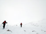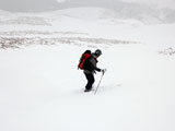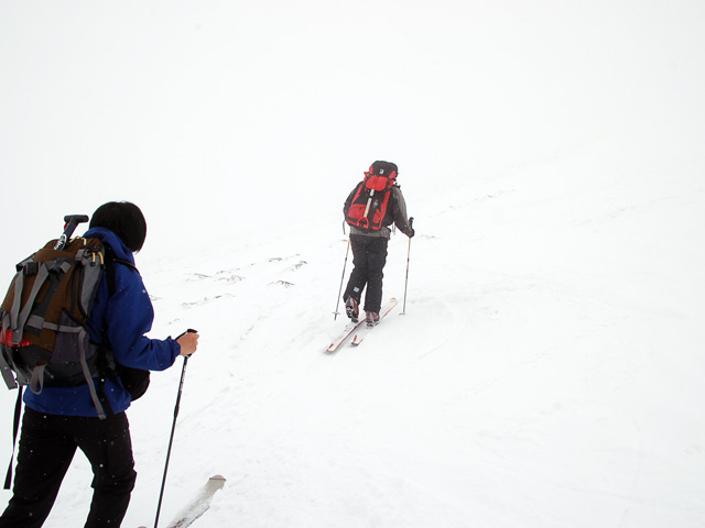 登山者は少なく、静かでのんびりとした雰囲気の中を出発。モナカ雪を踏みしめながら登っていくと、二段目から上ではウィンドクラスト気味の雪に・・天候も悪くなってきた。