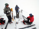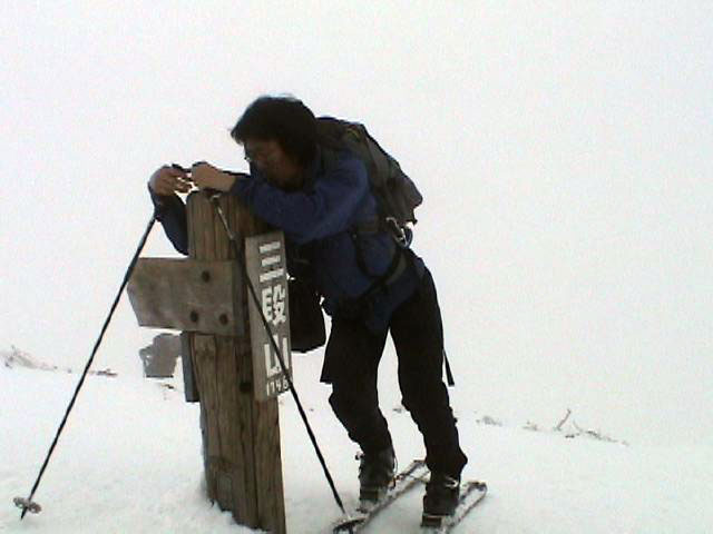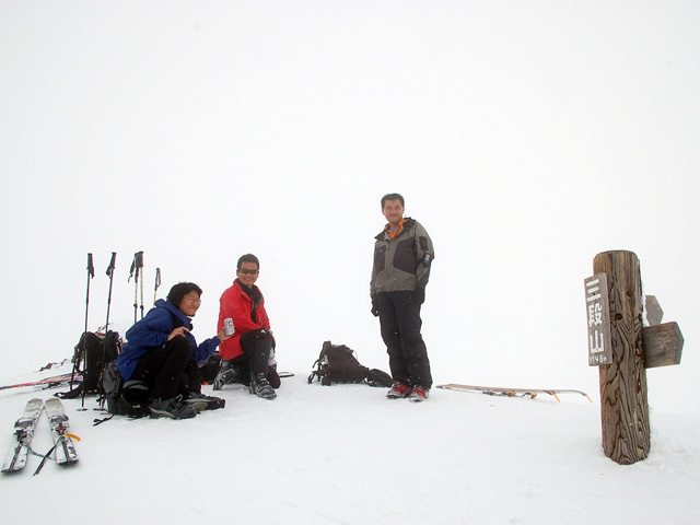 ガスの中山頂に到着。視界が無かろうが雪が悪かろうが、やっぱり嬉しくてビールで乾杯。