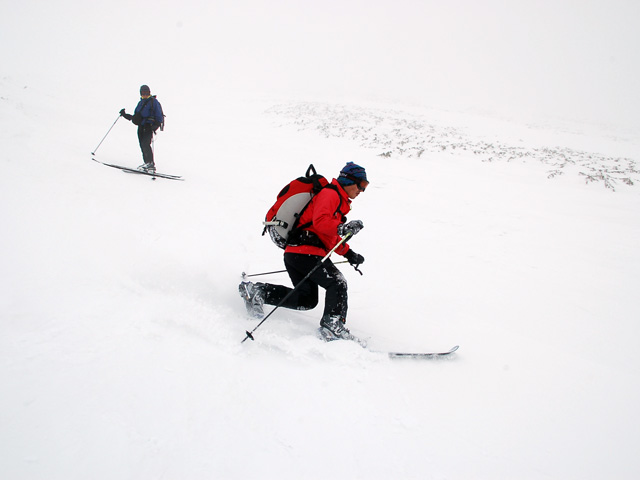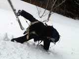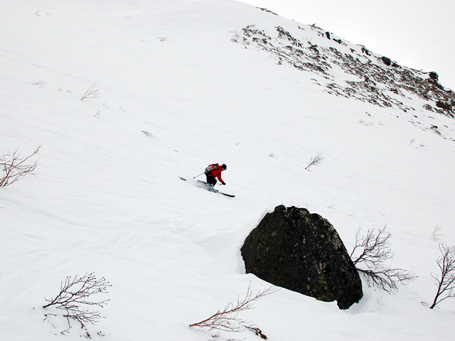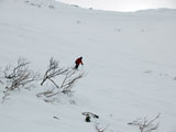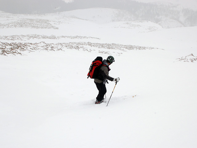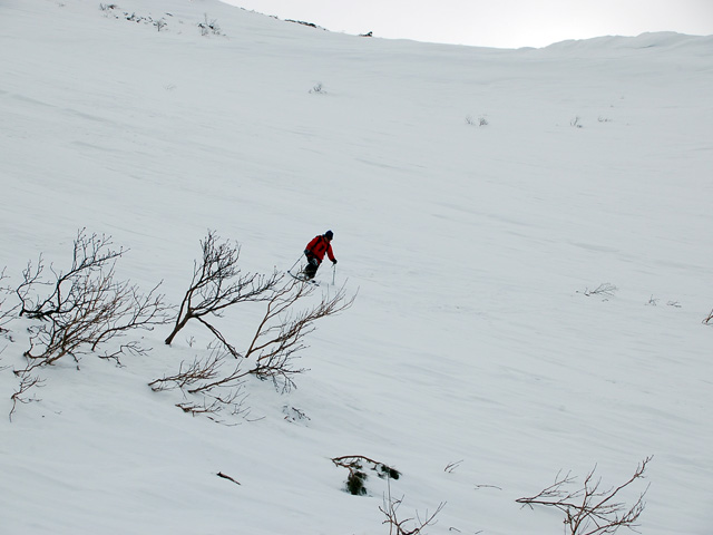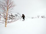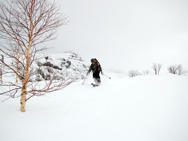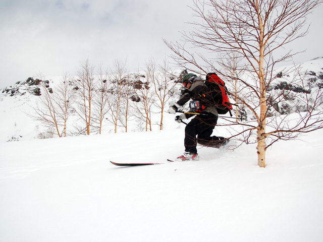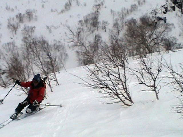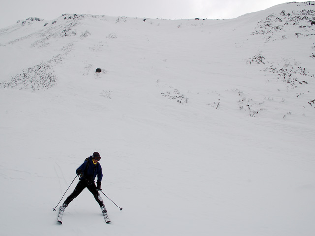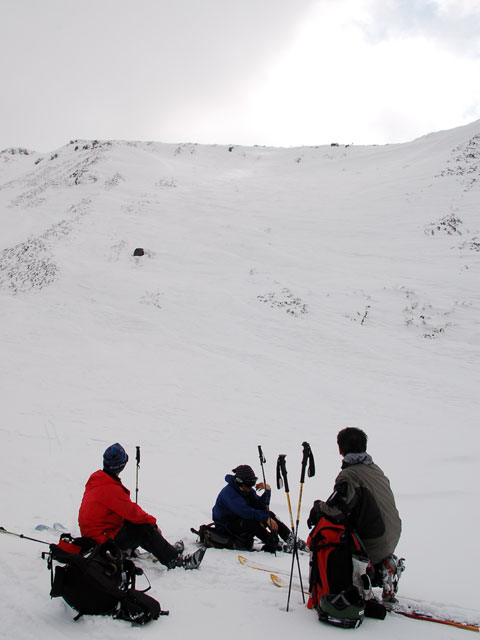 下りはフリコ沢や東谷を検討したが、どうルートを工夫しても悪雪はどうしようもなく、大テラスへ降りた後ナマコ尾根でやっとセメントみたいな雪を滑ることができた。