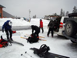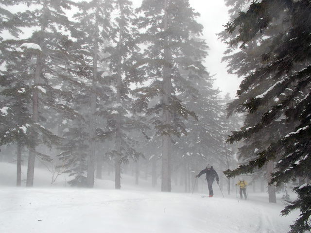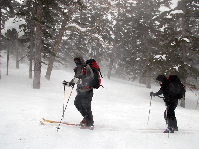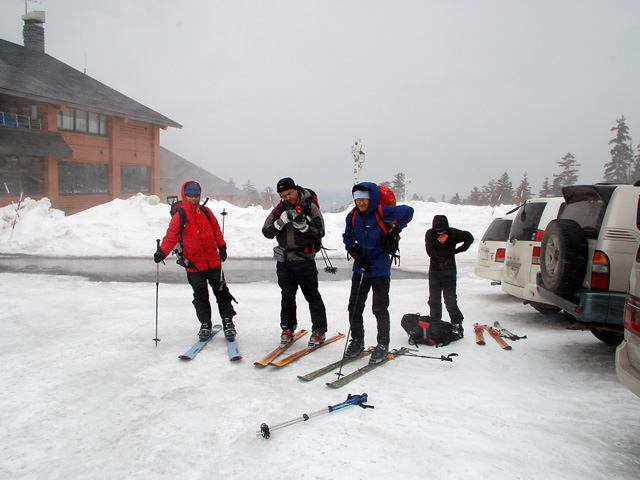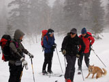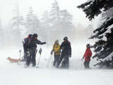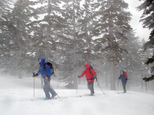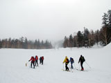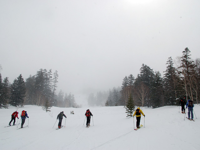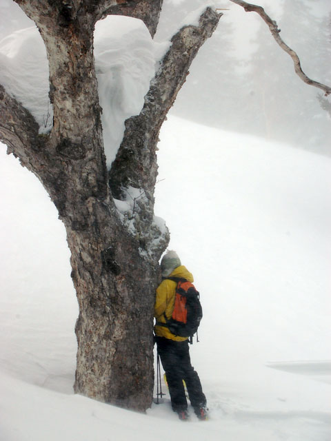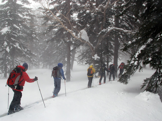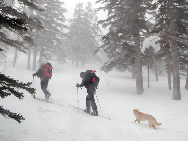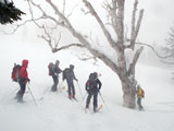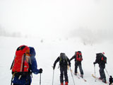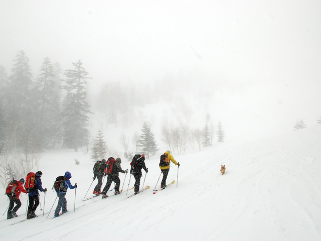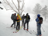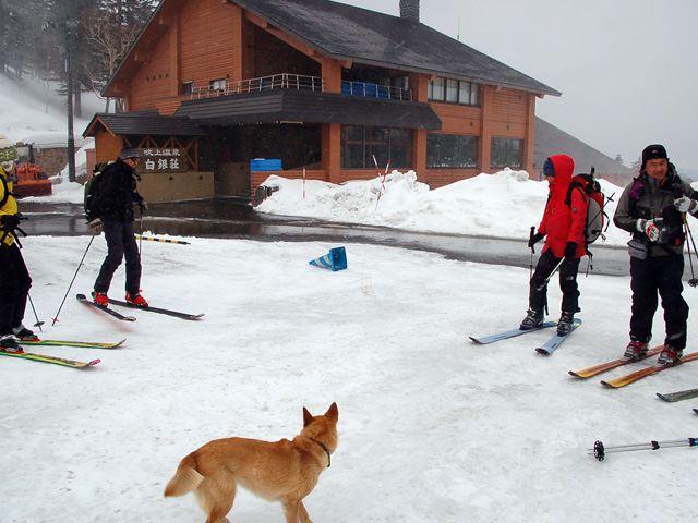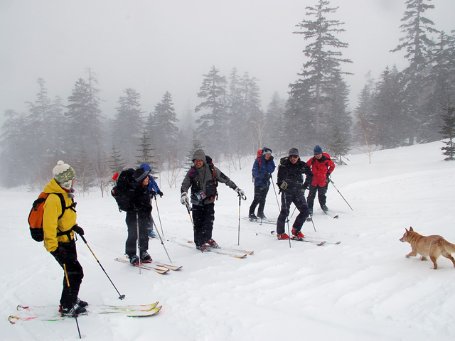 | 2007年4月14日(土) 三段山スキーツアー(強風悪雪 二段目で退却) 雪も悪けりゃ天気も悪い。そんな覚悟で出発した三段山。やっぱりダメでした。まぁこんな日もあるさ。 今回のツアー記録は、内容が乏しくてすみません。 天候:曇り 二段目より上はガス 気温:-2〜2度 風速:20m/s 雪量:十分 雪質:ウィンドパック〜モナカ〜なんじゃもんじゃ雪 コース:白銀荘〜二段山〜白銀荘 メンバー:旦那、ゆきこ、田中ファミリー(パパ、ママ、ゆうちゃん、Mix)、kinpeiさん、naokissさん、タカヤさん 計8名+1犬 |