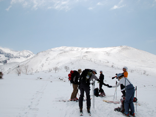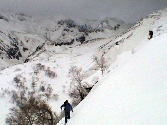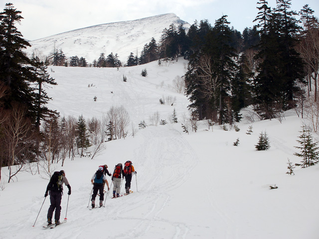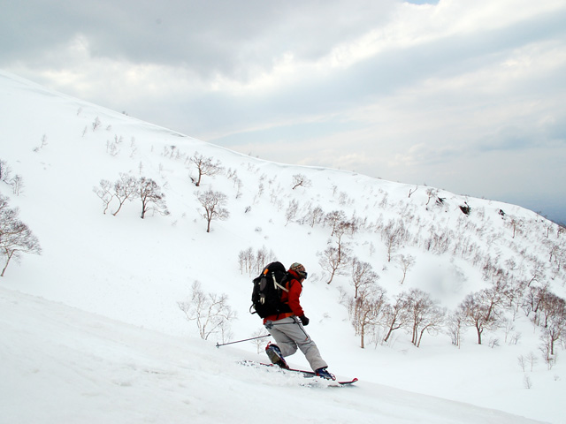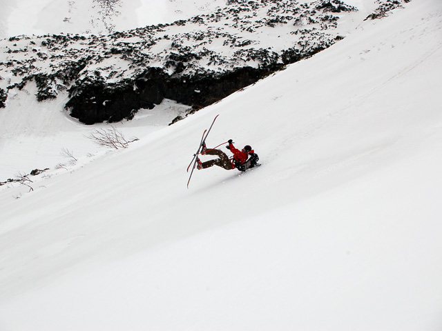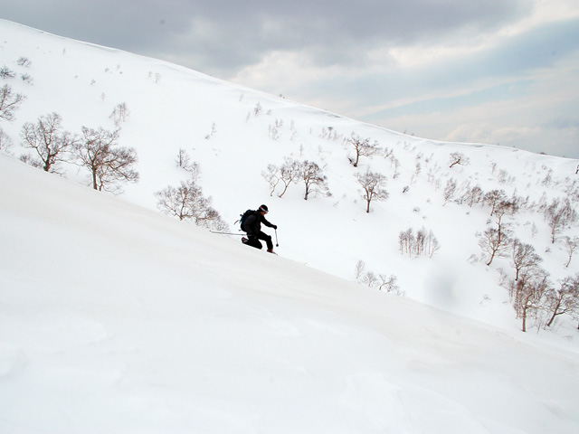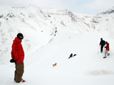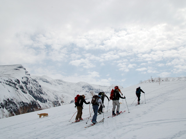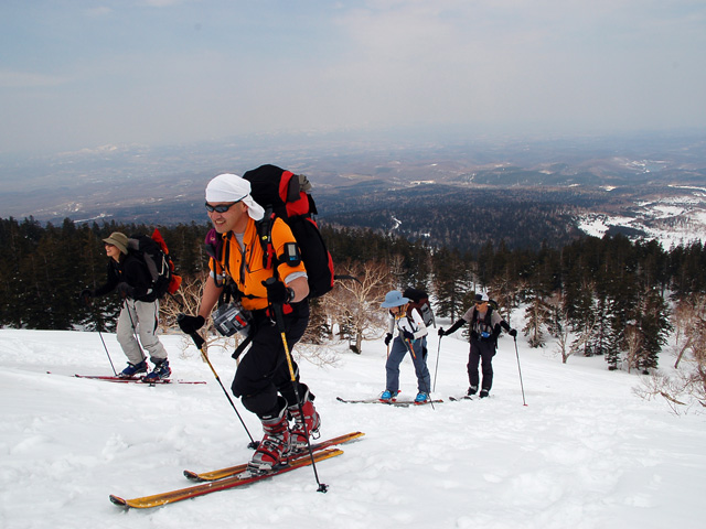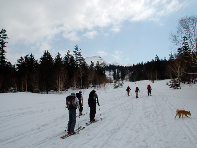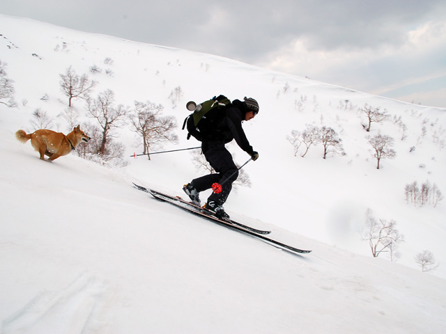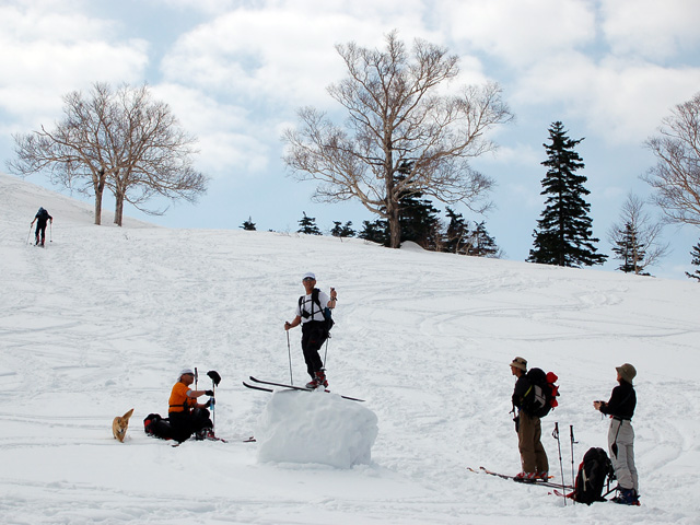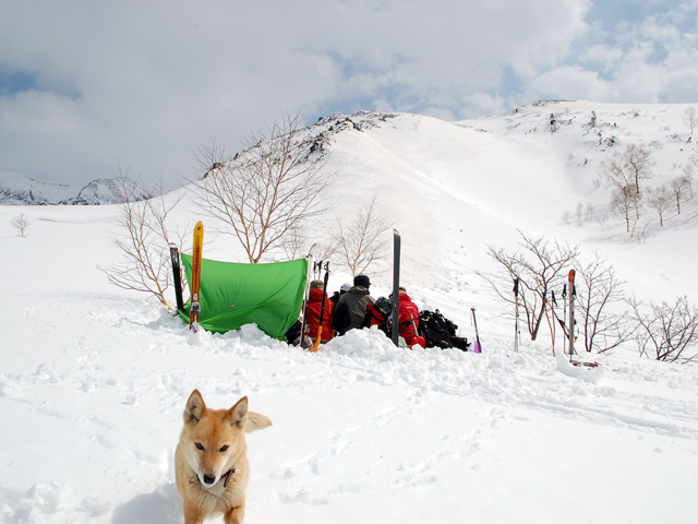 | 2007年4月29日(日) 三段山スキーツアー(悪雪焼き肉) どうも最近は天候と雪に恵まれないツアーが続く。今回も一昨日に 30〜40センチ程度の積雪があり、それが盛大に腐ってしまった状態に突入してしまった。雪には「妖怪板掴み」が多数生息していて、まともに滑ることができない。唯一の慰めは焼き肉・・ 天候:晴れのち曇り 気温:5〜10度 風速:4〜5m/s 雪量:十分 雪質:フィルムクラストと湿った新雪が縞模様になっている コース:白銀荘(9:27)〜(12:02)三段山山頂(12:22)〜フリコ沢〜白銀荘(15:05) メンバー:旦那、田中ファミリー(パパ、ママ、ゆうちゃん、Mix)、かっちゃん、スー、ピンキー、タカヤ 計8名+1犬 |