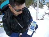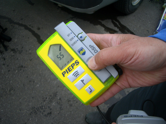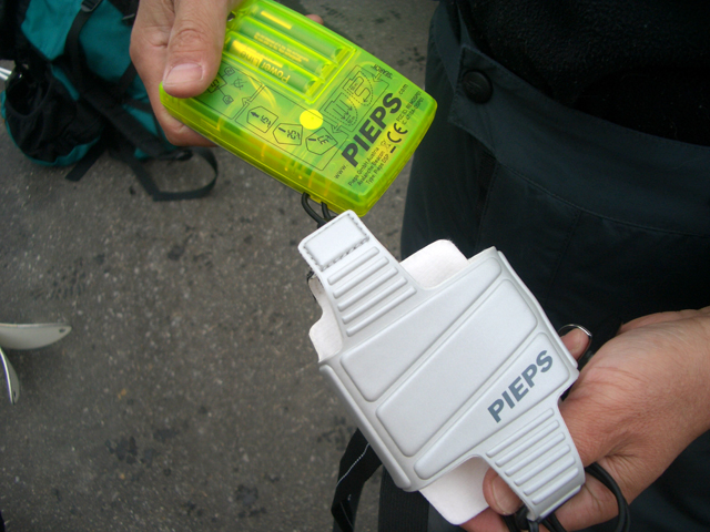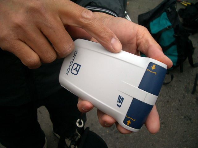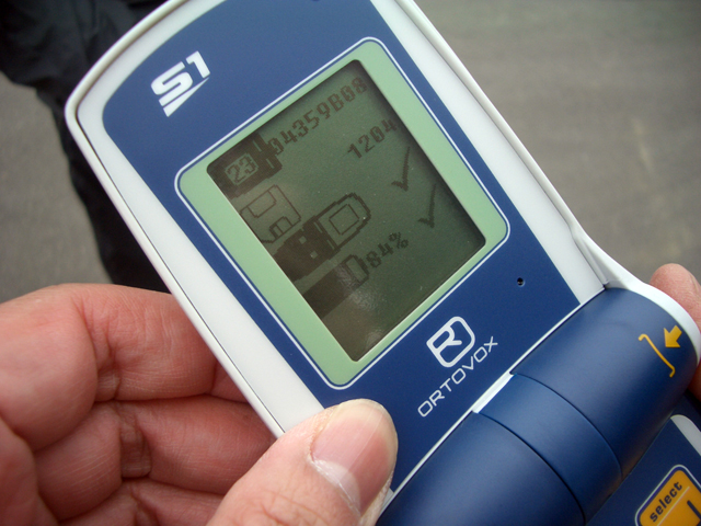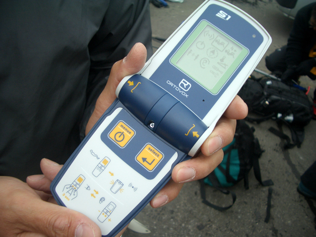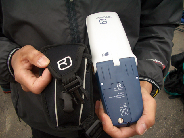 隊員は次期PIEPS DSPや、ORTOVOX S1などの各種最新装備を持っており、ビーコンマニアの旦那としては、特にORTOVOX S1を見過ごすわけにはいかず、ご好意でいろいろいじらせもらった。