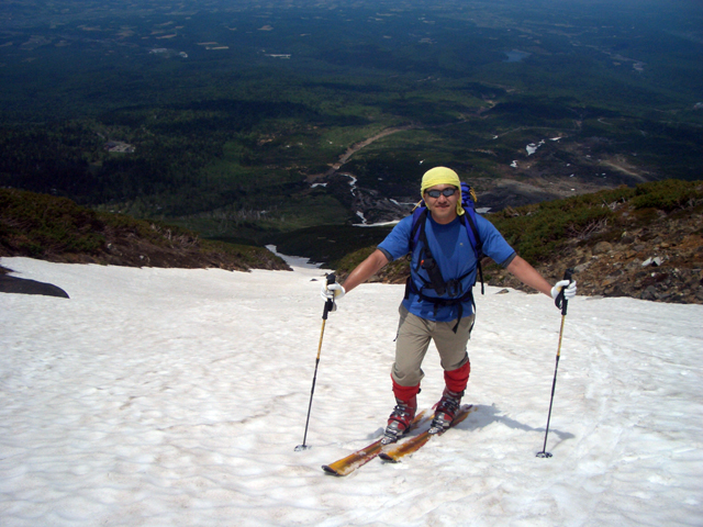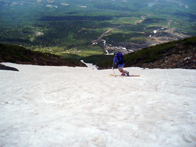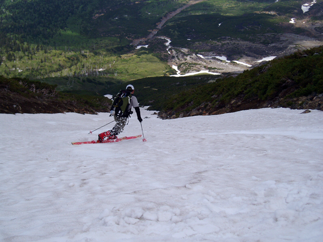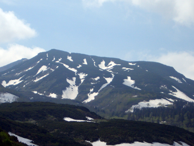 ![]() 白銀荘から見た前十勝 正面のY字雪渓が千春沢 |