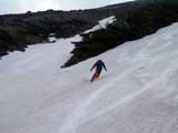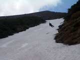 ![]() 千春沢雪渓下部(1130m)に到着 ここから見る雪渓は、続いていないようで続いている |