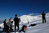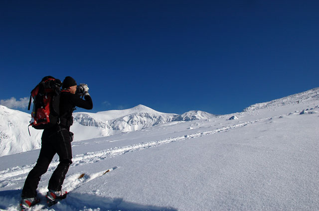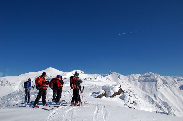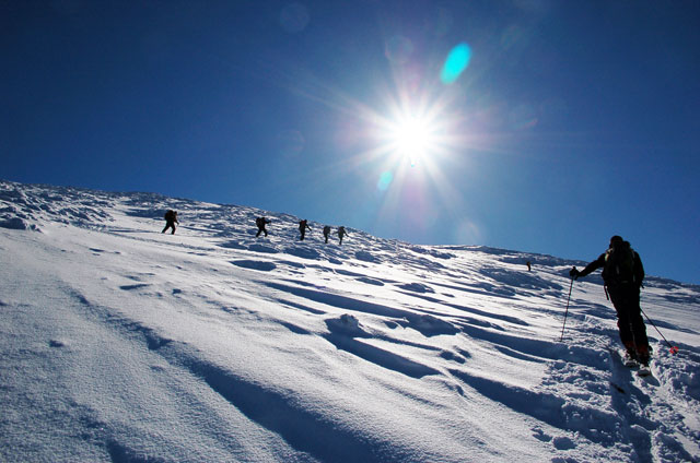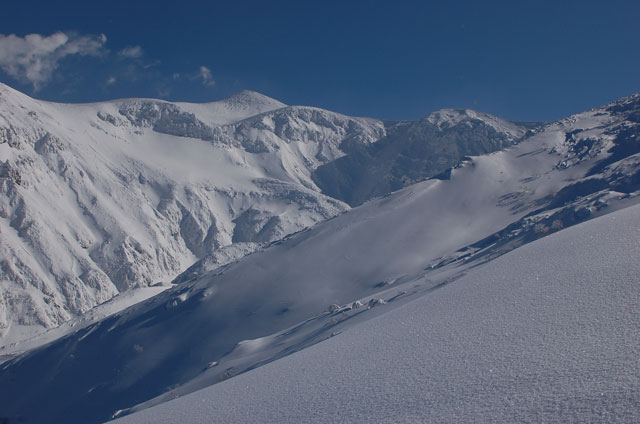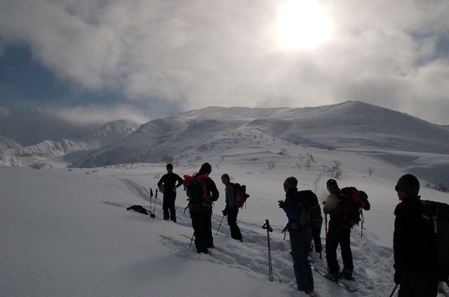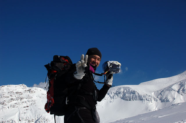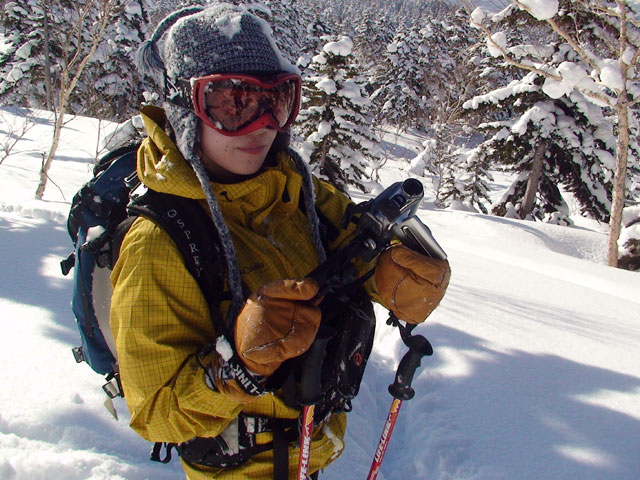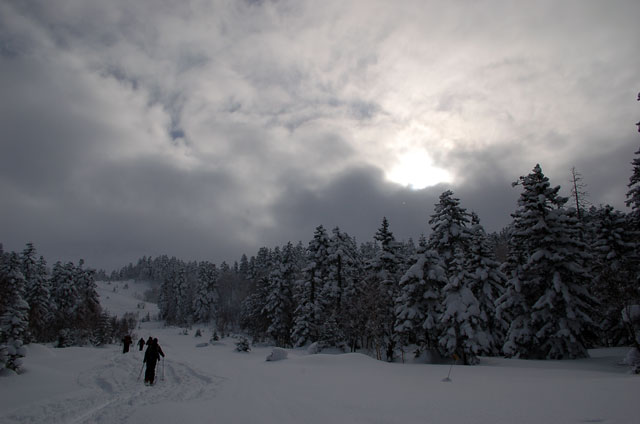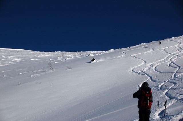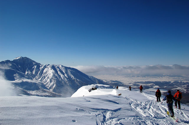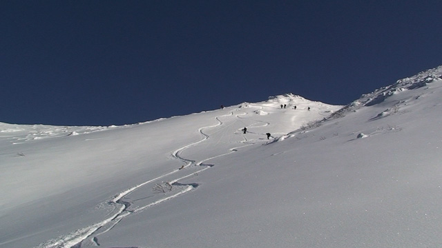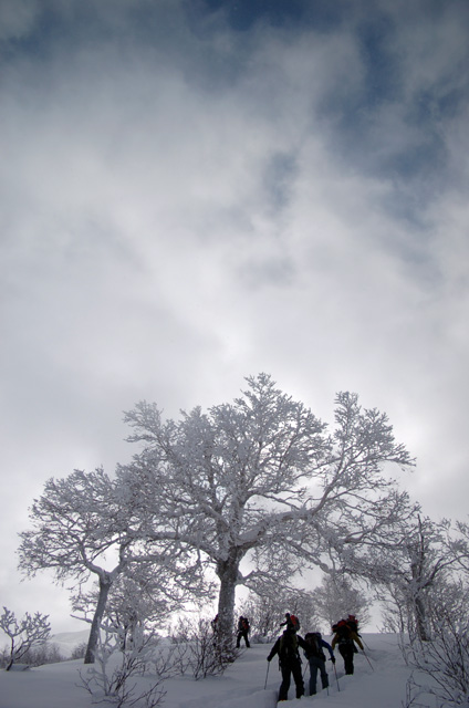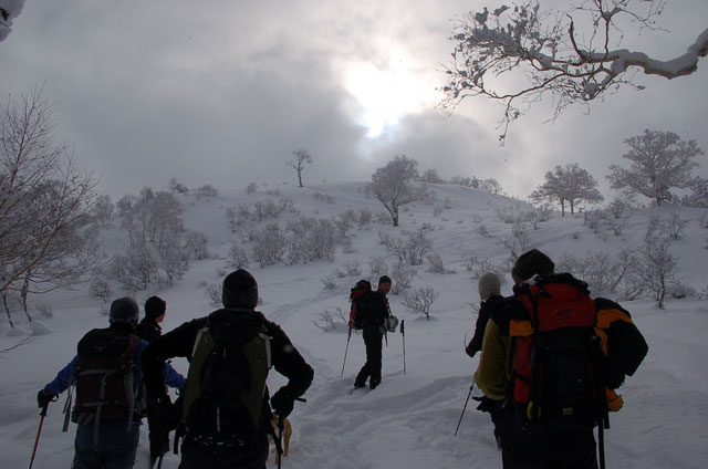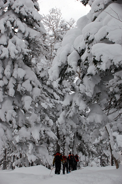 西の尾根は当然登り返し。ガイドの山小屋さんの一行やN崎さん達と一緒に滑り尽くした。