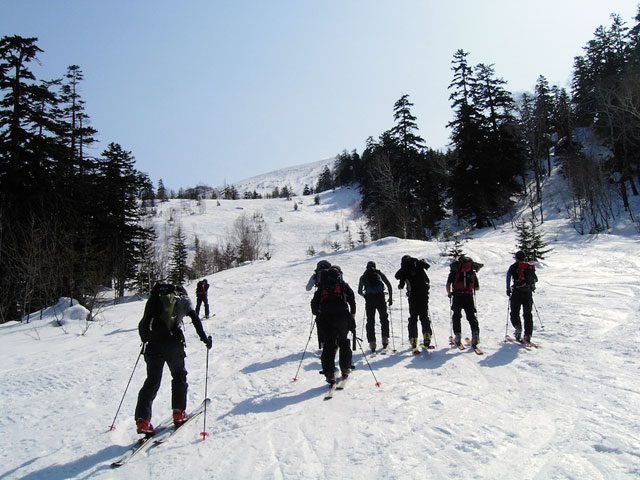 快晴が続く。昨日は雪質が今ひとつだったが、今回はザラメが進むことを期待して入山。