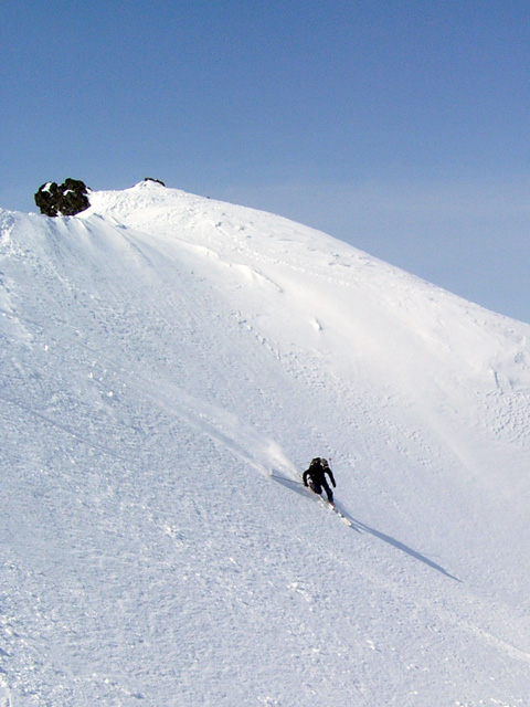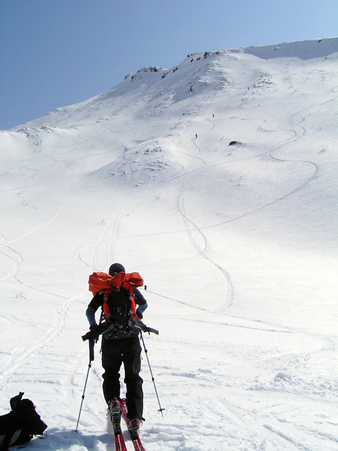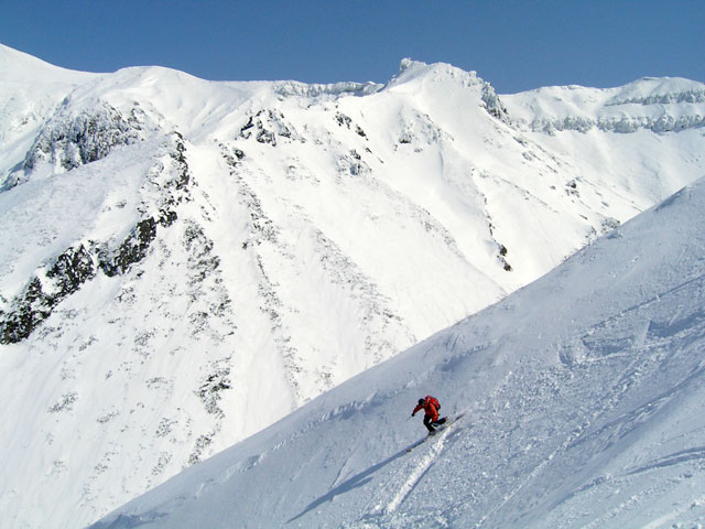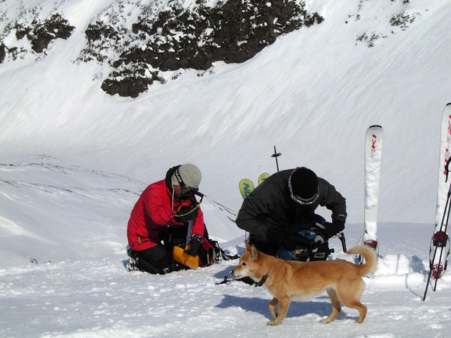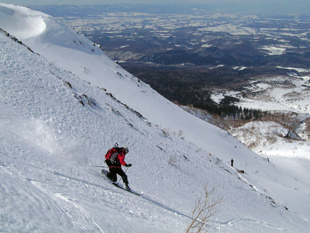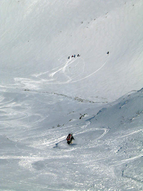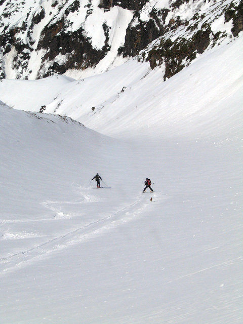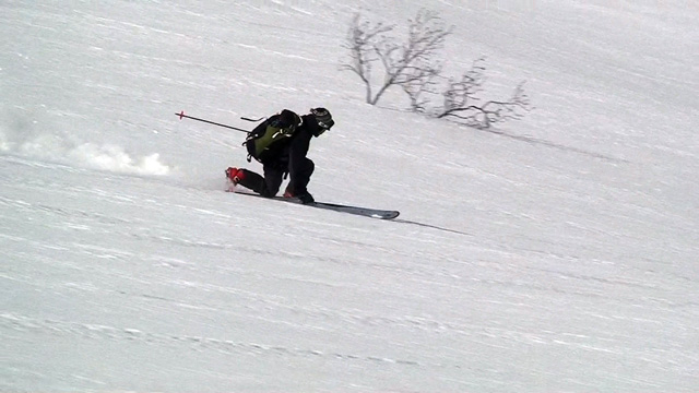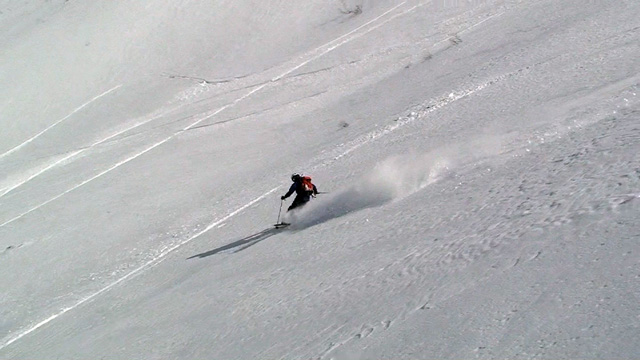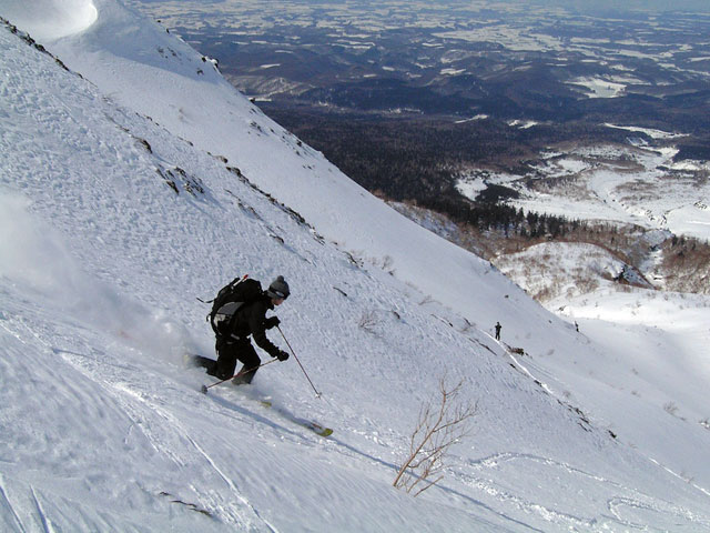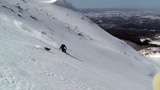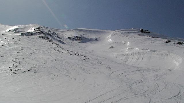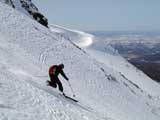 フリコ沢の雪質は滑降可能なレベルのモナカだったが、一ターン一ターンが気が抜けない。ちょっとでも躊躇したり、下手に板をずらそうとしたら吹っ飛ぶ。緊張を強いられる滑降となった。