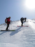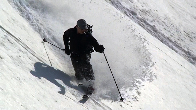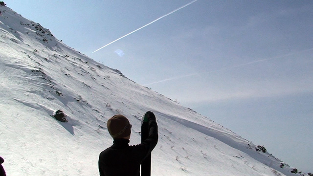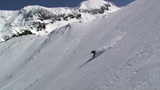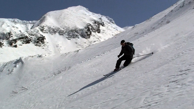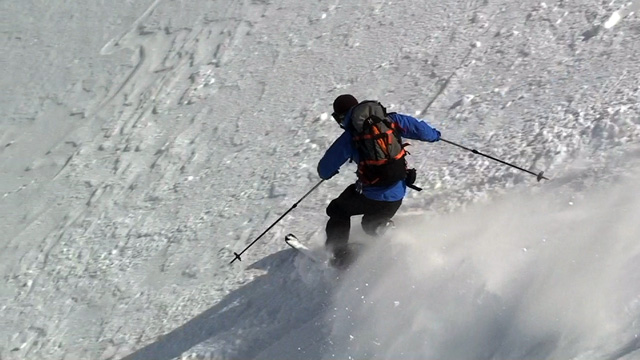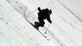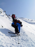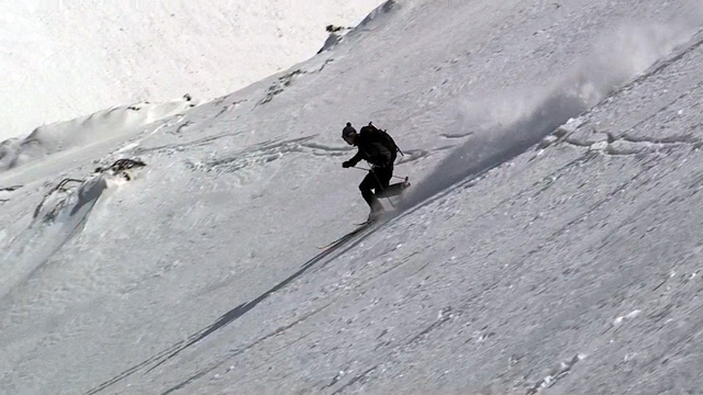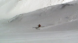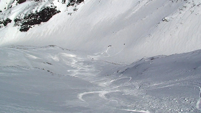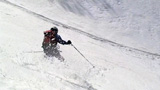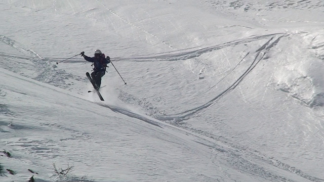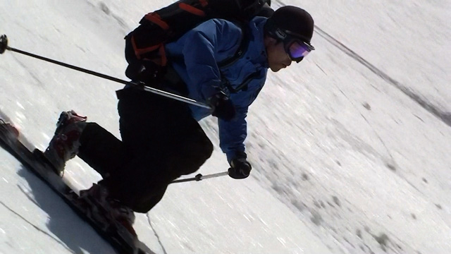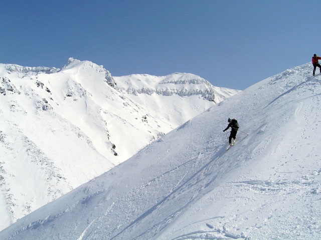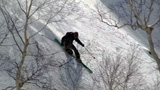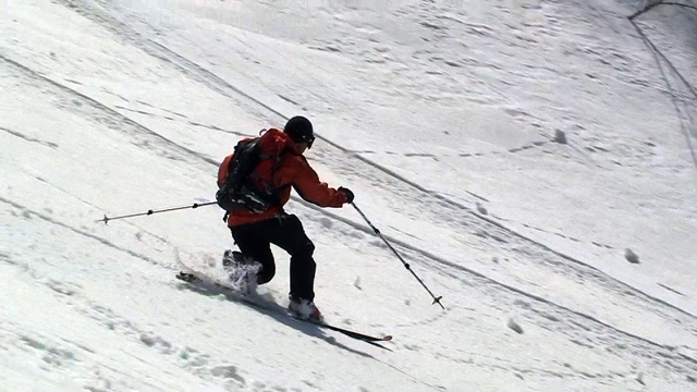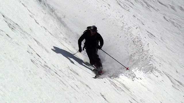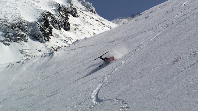 フリコ沢の雪質は滑降可能なレベルのモナカだったが、一ターン一ターンが気が抜けない。ちょっとでも躊躇したり、下手に板をずらそうとしたら吹っ飛ぶ。緊張を強いられる滑降となった。