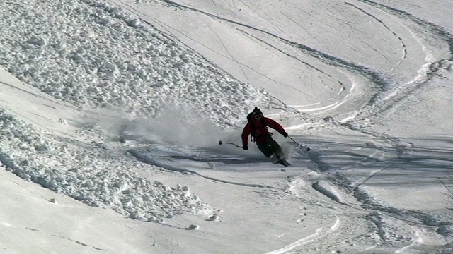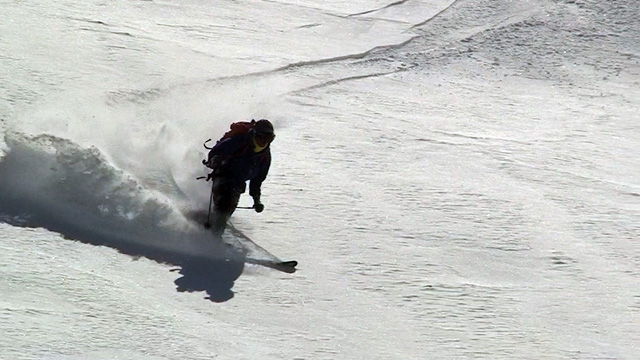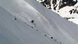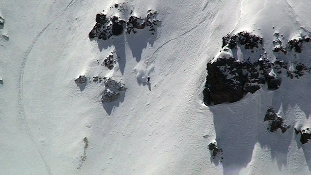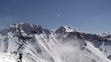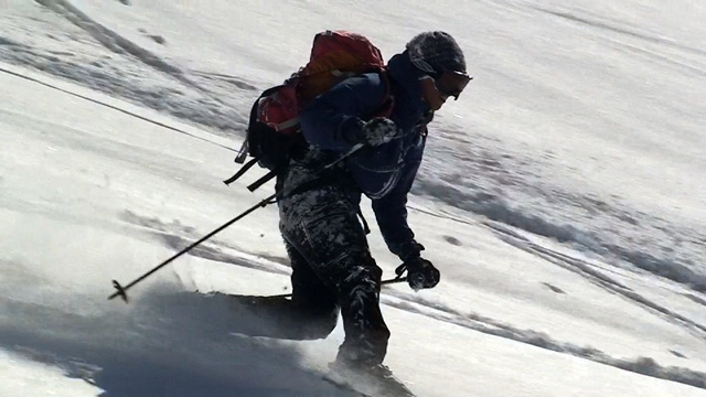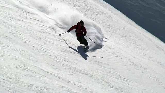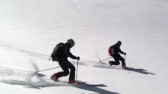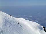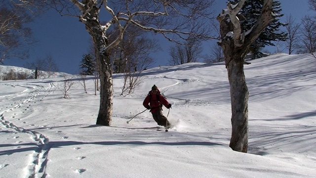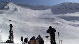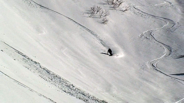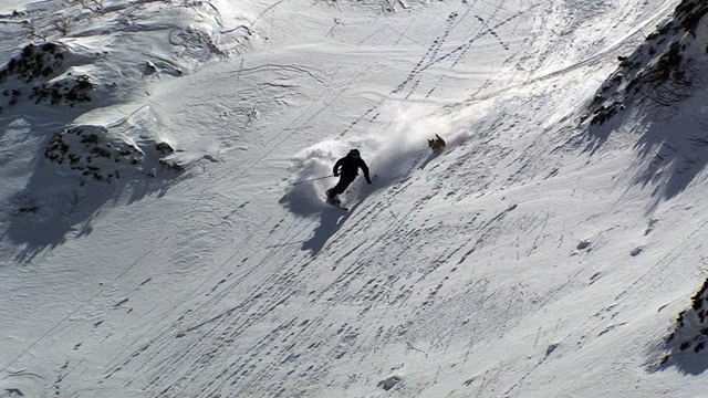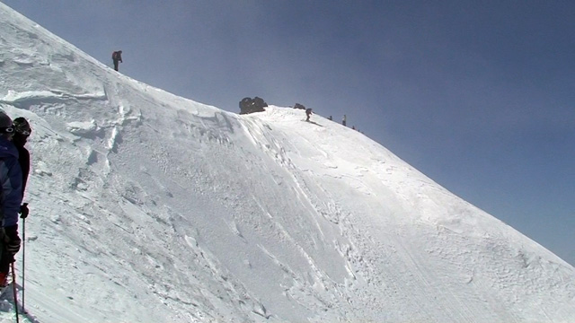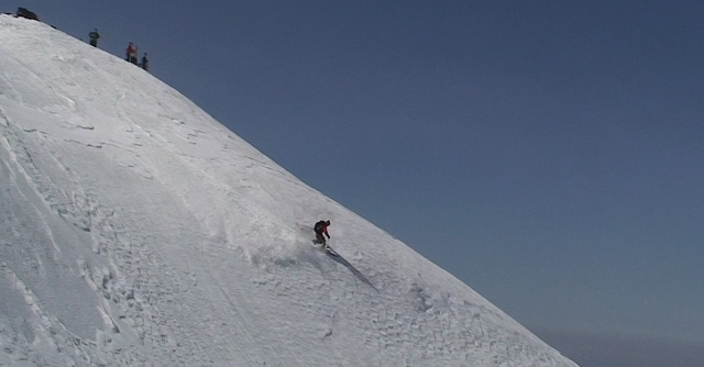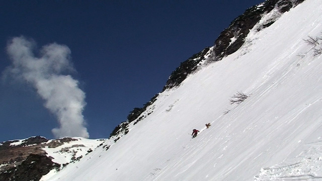 山頂に上がると、ケニアさんが16mmを回している。対面の上ホロシュートをプロスキーヤー達が滑り降りていた。素晴らしい光景だった。