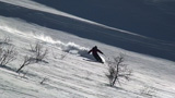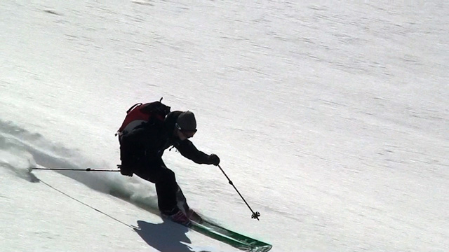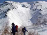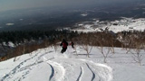 その滑降の様子から雪が良さそうだと思い、山頂からフリコ沢へ落ちてみたらこれが大違い。