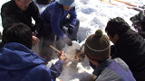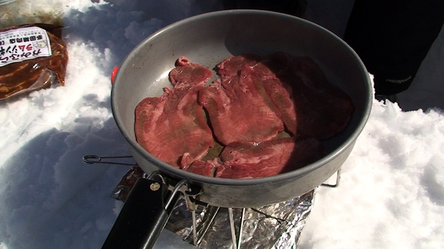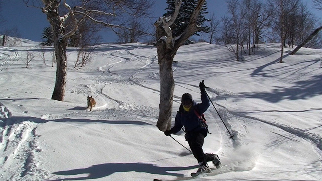大テラスでは念願の焼き肉!そこへヘルメットカメラを回しながらGakuさん夫婦も降りてくる。東谷では、表層の新雪でスラフを発生させながら気持ちよく滑った。