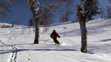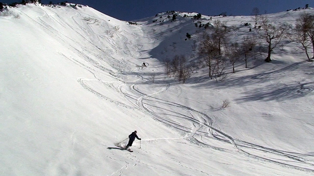 フリコ沢の下部からは、クラストの上に新雪が5センチほど乗ったコンディションに変化してくれて、快適な滑降を楽しめた。