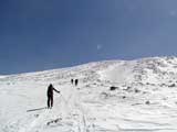 今回の三段山は大賑わいで大人数のパーティが目立つ。ナガ靴とスノーシューで山頂を目指す人も出てきた。すっかり春山の様相だ。