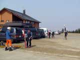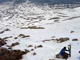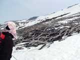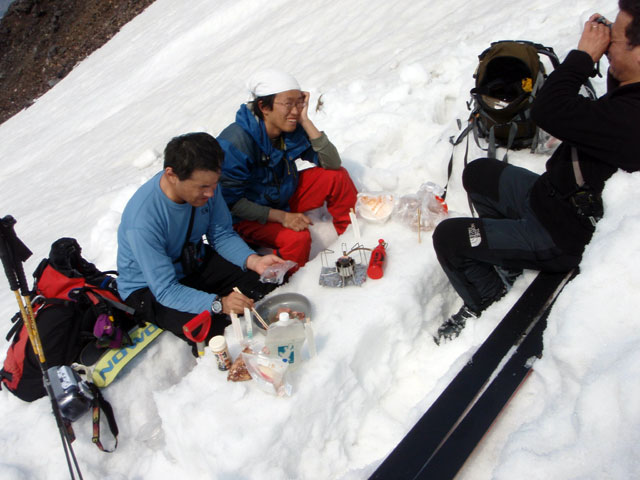風を避けてボウル斜面の手前で焼き肉場を設営。