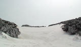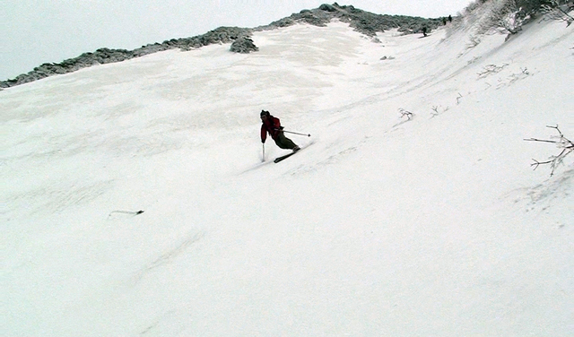 日射で雪が腐るのが心配だったことと、視界があるうちに滑りたかったので、稜線のかなり手前から滑降開始。