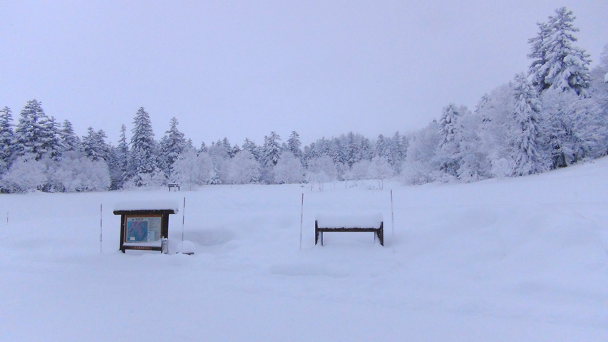 登山口から見た雪の量は予想よりも多く、ササもほとんど隠れていた。白銀荘の従業員によると、この時期にこれだけ雪が積もっているのは珍しいという。