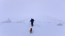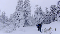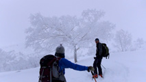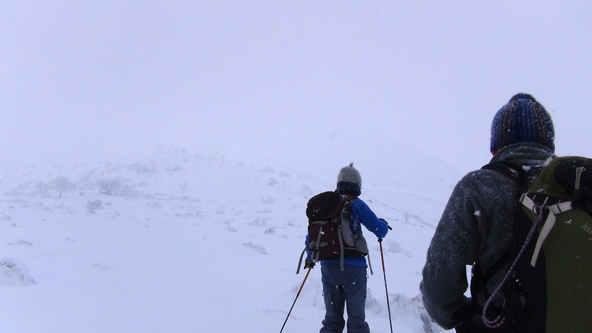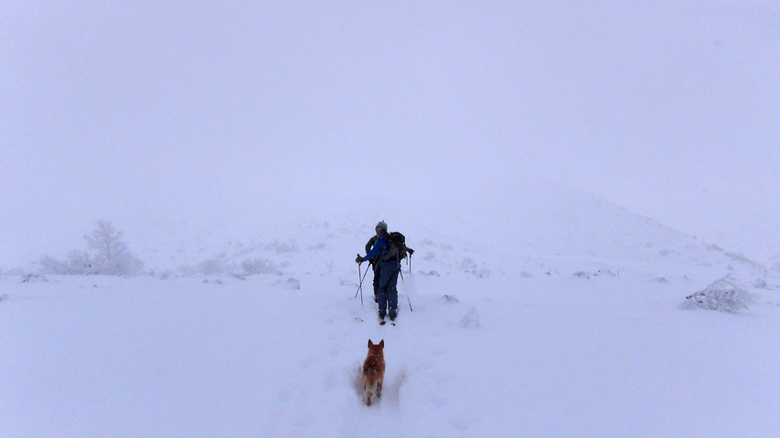 二段目上のハイ松は、この時期にしては隠れていた。ここら辺から視界が低下し、なにより寒さが厳しくなってきたので、廊下の突き当たり1550m付近から下山することとしたが、雪付きは良いので山頂までスキーで十分到達可能だろう。