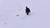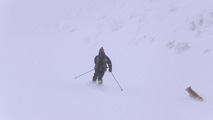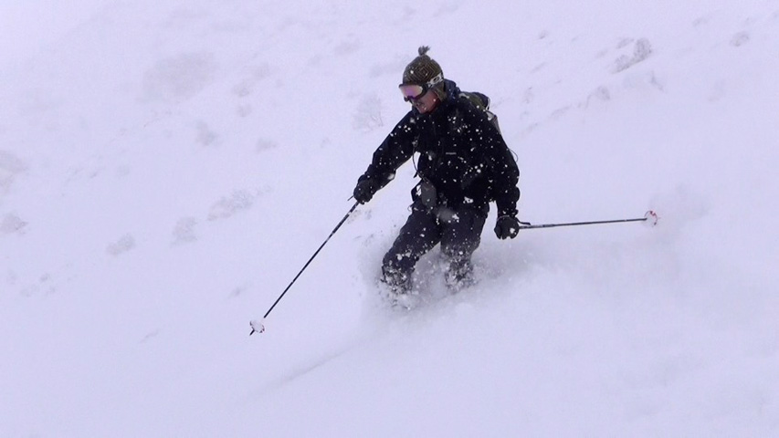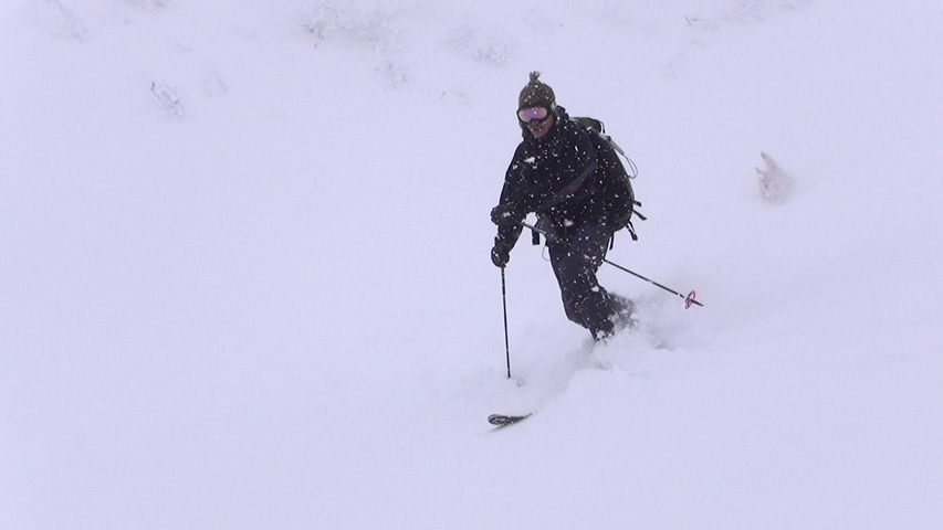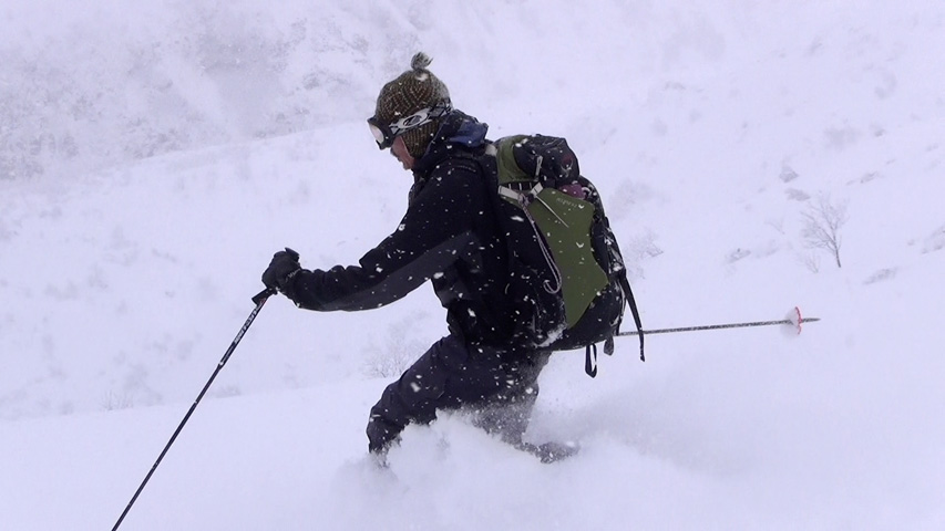上部の雪質はパック気味で重たかったが、高度を下げるほどに軽い雪質になっていった。二段目から下の雪は素晴らしく、気持ちよく滑ることができた。
