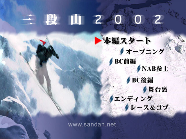 | 三段山クラブでは1999年の発足当時より、三段山周辺の景観と共にテレマーカー達の滑りや、登攀の様子などを紹介するオリジナルビデオを制作しています。そのビデオの最新版が、「三段山2002」です。 |