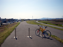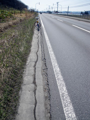問題はリカンベントトライクの車幅を許容できる安全な通勤ルートの確保だ。当初からリカンベントを購入したら積極的に通勤に使おうと考えていたのだが、通勤路の途中(堤防上の道)には何カ所も車止めが設置されている(写真)。また片側一車線の国道も走るのだが、その路側帯の状態が悪い上に幅が狭い(写真)。