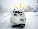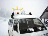 | 回転灯?なぜ山の道具箱に回転灯なの? もっともな疑問です。しかし、私にとっては欠かせない山のアイテムなのです。 毎週のように三段山へ通っていますと、かなり気象条件の厳しい日もあります。 早速ホームセンターから安物の工事用黄色回転灯(5〜6千円)を仕入れて、ルーフに直接マグネットでくっつけて使用していました。しかし、この取り付け方法では雪が積もるとすぐ埋もれてしまったり、位置が低すぎて後方車から回転灯が見えないなどの欠点が明らかになってきました。 猛吹雪の中、回転灯を回しながら爆走するのは痛快です。頭の中には、Uボートのテーマ曲が鳴っています(真似しないように)。 ちなみにカーナビも重宝しています。視界の悪い時にカーブの多い山道などで、地図画面を最大倍率にして文字通りラリー・ナビゲーターとして活躍させています。50メートル先easy right! maybe?とか、500メートル直線!フルスロットルGO!とかぶつぶつ言いながら。理論的には視界ゼロでも運転できる筈ですが(くれぐれも真似しないように)。 |
