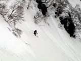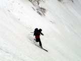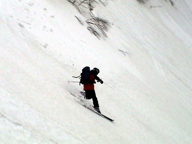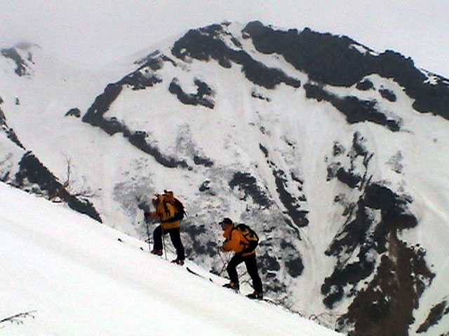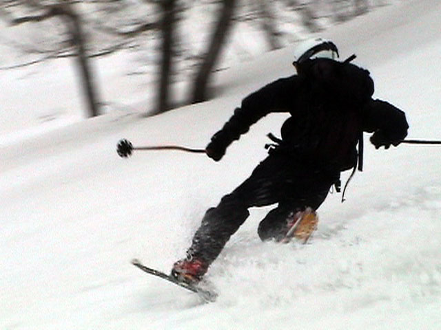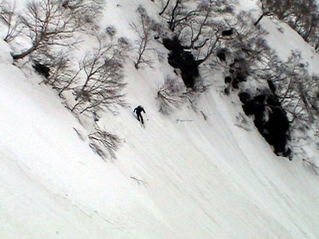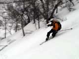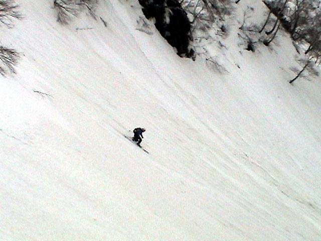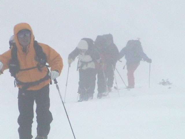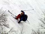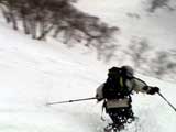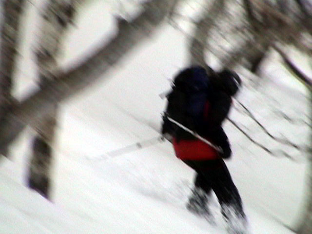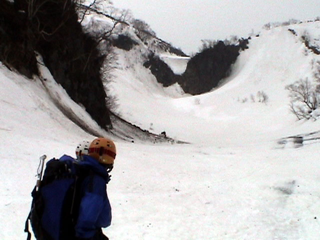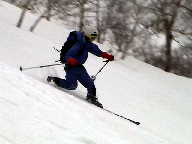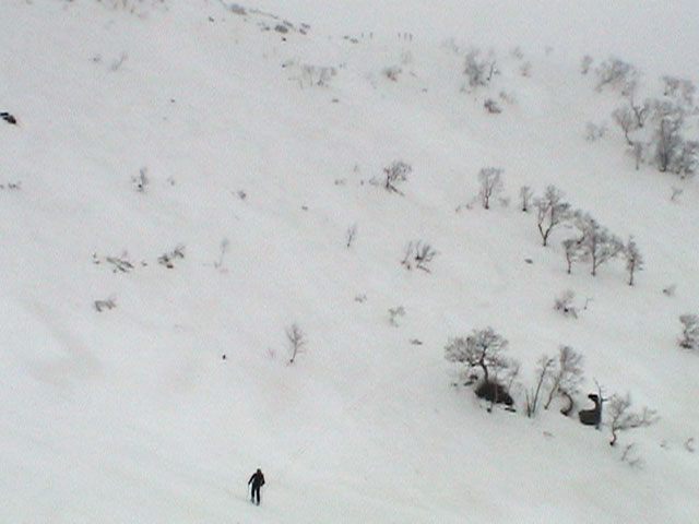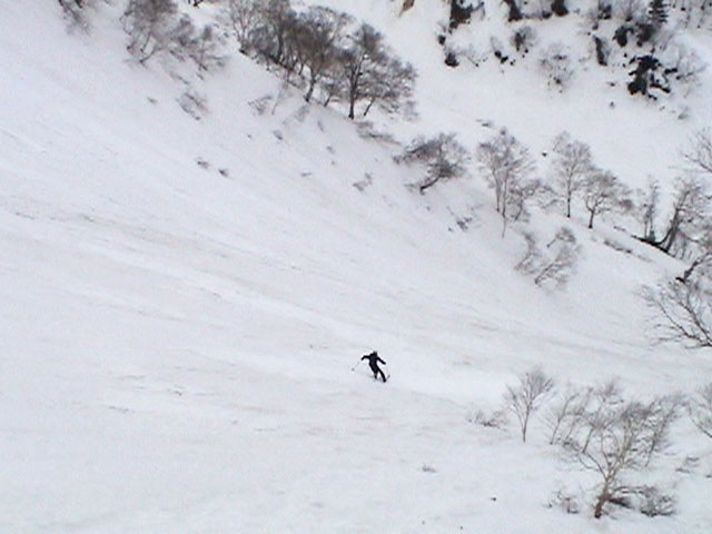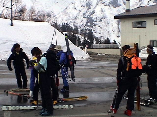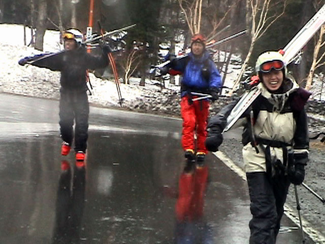 | 2003年4月29日(火)みどりの日 三峰山スキーツアー(土砂降りスキーは盛り上がる!) 熊の出没が心配な時期なので、装備としては一応熊避けスプレーを装備。あやぼんが上下ツルツルのカッパを着ていたので、旦那は滑落をかなり心配した。 凌雲閣を出発するときには、天候は高曇りでまあまあの条件だった。雪は例によって深いザラメ。 途中、谷をスキーで滑降したりしながら順調にテラスに到着。ここまでは天候もなんとか保っていた。ここからさらに三峰山への稜線へ上がるかどうか悩んだが、せっかくだからとさらに上がってみた(大失敗)。 稜線に上がるにつれて、どんどん南西の風が出てきて雨がぱらつき始めた。そして、新得側の雲がこちらへ・・まずい、雨は降っても良いが、ホワイトアウトだけは困る。 そして・・・稜線に到着すると同時に、めでたくホワイトアウト。こうなるともう滑降の楽しみは放棄するしかない。 三峰山の崖からの滑降を楽しみにしていた、かっちゃんやリチャードはかなり不満そうだ。 雲の下へ出て、やっと視界が回復しても雪の状態は大変芳しくなかった。ハイマツの付近は落とし穴状態。深いザラメはハイサイド吹っ飛び転倒を誘う。 旦那は、ビデオカメラのレンズに付く雨粒をふき取る作業に疲れ果てた(もーいや)。 深いザラメに足を取られて灌木に顔面から激突した人も居たけど、ヘルメットのおかげか概ね無事。そういえば今回のメンバーは全員ヘルメットを着用していたな。 かなりやられながらも、新しい斜面を開拓しながら三峰山沢まで降りてきた。そのあたりから雨足が強くなり、ついに土砂降り状態へ。 こうなると、あやぼんのカッパがうらやましい。 「イェー!」「雨最高!」「土砂降りスキー!」などと最後に大いに盛り上げてツアー終了。終わってみると意外と楽しかったよ。トラブルや悪条件を楽しめるメンツでした。 天候:曇り〜雨 気温:測定していません。寒くはなかった。それより濡れて・・ 風速:0〜10m 雪質:深いザラメ 雪量:十分 メンバー:旦那、ゆきこ、toshi、ぱっちまん、スー、かっちゃん(俺流)、リチャード、あやぼん 合計8名 コースタイム:凌雲閣9:00-11:47三峰山の稜線(1675m)12:03-13:30バーデン上富良野 |