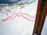 東谷の核心部で雪崩の痕跡を見つけた。強風が吹き荒れた昨日発生したものらしい。