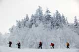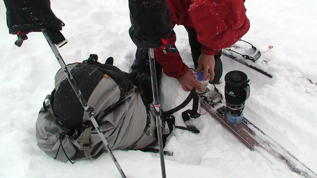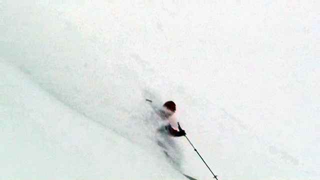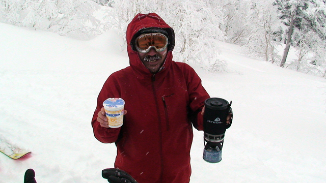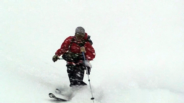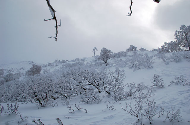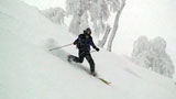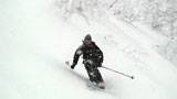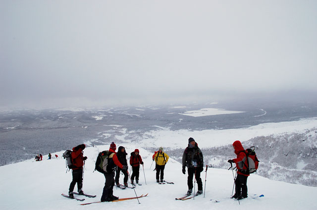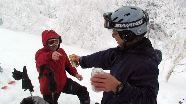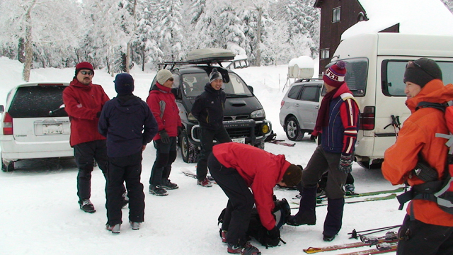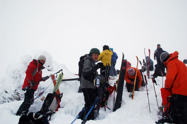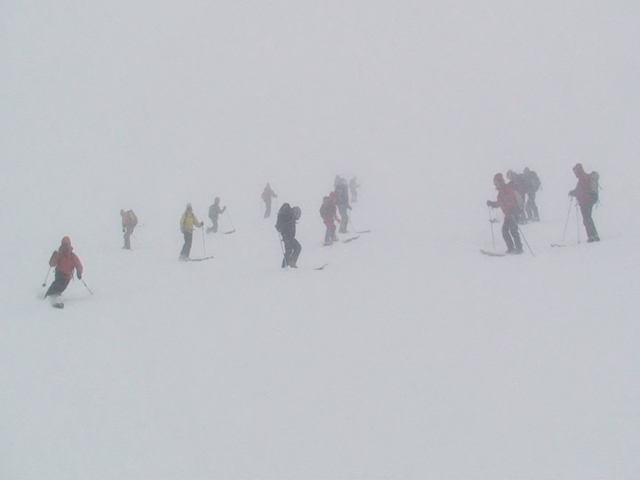 雪質は上々なのに、ホワイトアウトでまったく滑ることができない。慎重に降りても1メートルほどの深さの吹きだまりへ落ちたりして、皆で先頭を譲り合う(^_^;)。