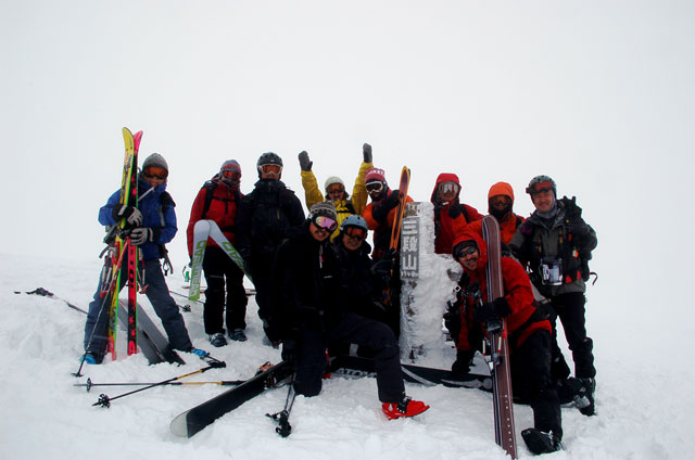 風に押し上げられるように、なんとか山頂に到着。12名全員が登頂できて嬉しい。