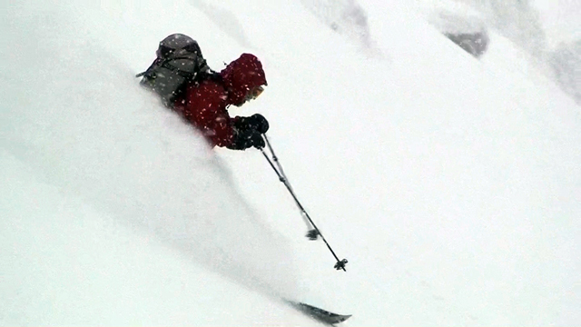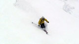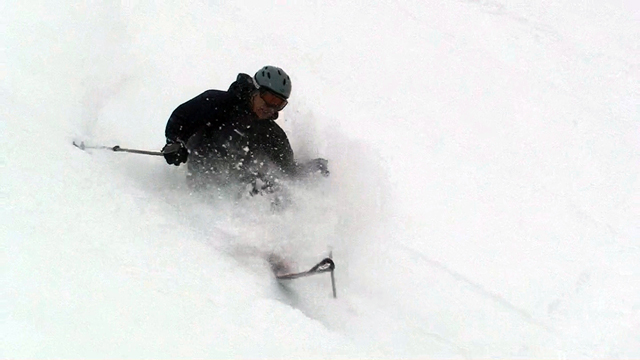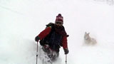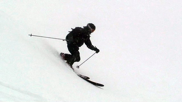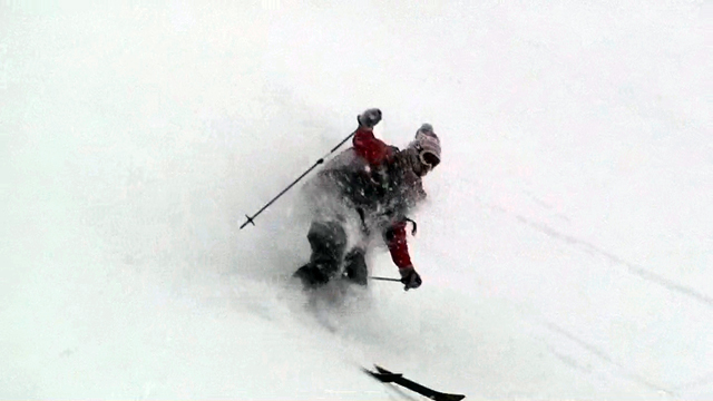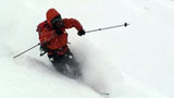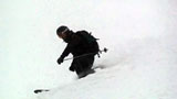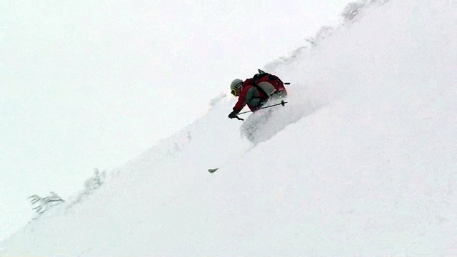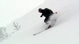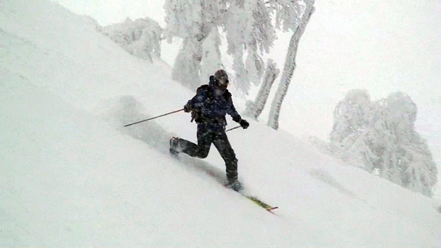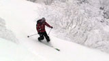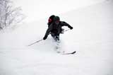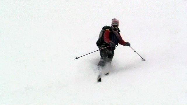 廊下の下部でやっと視界が晴れてきたので、そこから西尾根へトラバースして念願の新雪滑降を楽しむ。