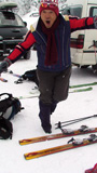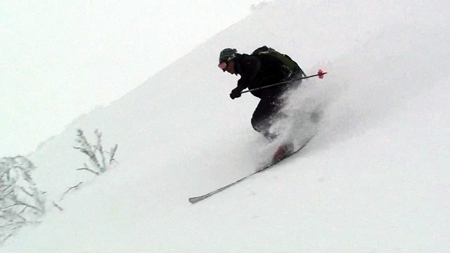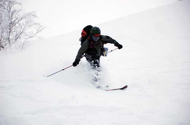 ちょっと癖のある雪質で、細板&皮靴のぱっちまんが側転して吹っ飛んでいた。でも十分楽しめるパウダー。あんまり面白いので登り返してもう一本。山小屋さん一行と出会ってから樹林帯を滑って終了。